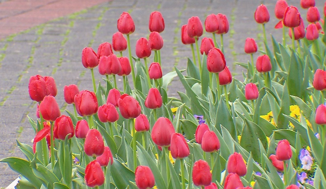 上午,雨水暂歇,天空阴沉,风力较大,体感偏湿冷。金山滨海公园内,树木枝叶在风中沙沙作响,水面荡起阵阵涟漪。但冷风挡不住春意的来临,柳枝抽出新芽,各色郁金香明艳盛开,少许市民在园内散步、闲谈。