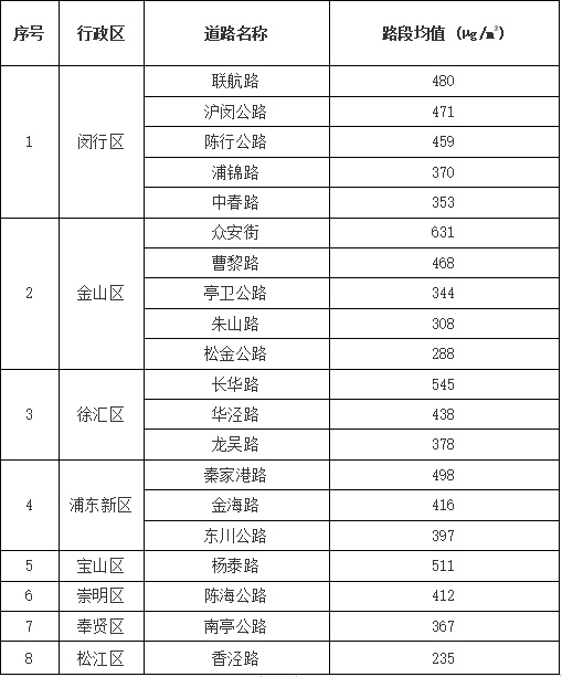 全市PM10浓度最高的前20条包括闵行区联航路、金山区众安街、徐汇区长华路、浦东新区秦家港路、宝山区杨泰路、崇明区陈海公路、奉贤区南亭公路和松江区香泾路等。