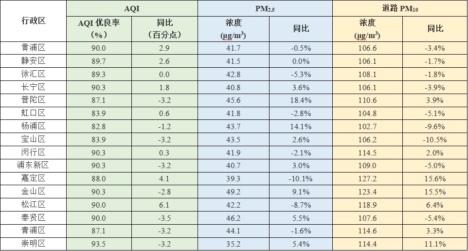 各区AQI优良率在82.8%(杨浦区)~93.5%(崇明区)之间。各区PM2.5浓度在35.2(崇明区)~49.2微克/立方米(金山区)之间。各区道路PM10移动监测月均浓度在102.7(杨浦区)~127.2微克/立方米(嘉定区)之间。
