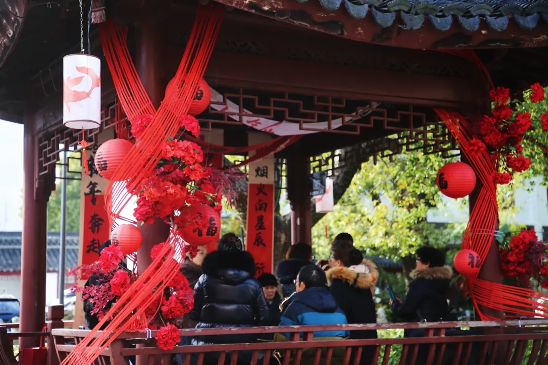 拿着刚出炉的团圆糕,沿老街慢慢走——凉亭、廊檐挂满红灯笼、中国结,老树枝丫也系着缕缕红绸。有人在亭下歇脚吃糕,呵着白气说笑,画面仿佛年画活了过来。