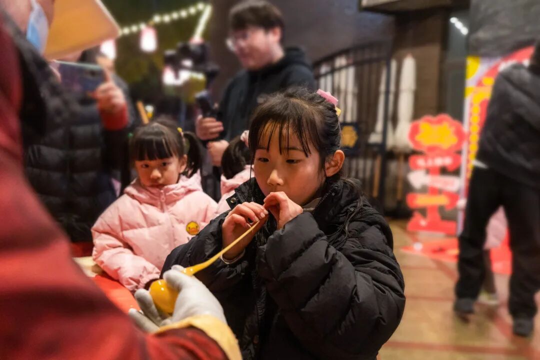趣味游戏区同样人头攒动,投壶、猜灯谜、吹糖人等小游戏让市民们玩得不亦乐乎。最受孩子们欢迎的当属吹糖人摊位,糖人师傅将熬好的糖稀搓成圆球,捏出一个小巧的吹气口。随后,把糖坯递给身旁的小朋友,手把手教孩子轻轻吹气。“慢点吹,糖坯慢慢鼓起来了!” 师傅的手也没停下来,快速捏塑。不一会儿,一只胖乎乎的小猪就成型了。“让孩子自己参与进来,比直接做好给他们更有趣味性,孩子们也更有成就感。” 糖人师傅向记者说。