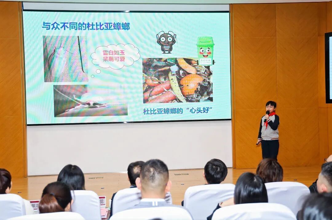 来自红旗小学的郑馨悦,作为“小小公民科学家”称号获得者,在现场分享了自己对蟑螂的探究成果:“杜比亚蟑螂可以帮助我们消灭厨余垃圾。”