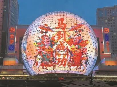 相比主展区,分展区的内容更注重用现代化的表达激活传统文化元素。以美罗城分展区为例,我们在1到5层设置了趣味造型展板,并通过数字年画动漫投屏、线上送福卡、现场领取“通关文牒”、按响“财神家的门铃”等多元形式,对传统年画、门神画、古代风俗画、老商标中的节日元素等,进行创造性转化,让市民在沉浸式体验中,感受海派文化的独特魅力与时代新意。