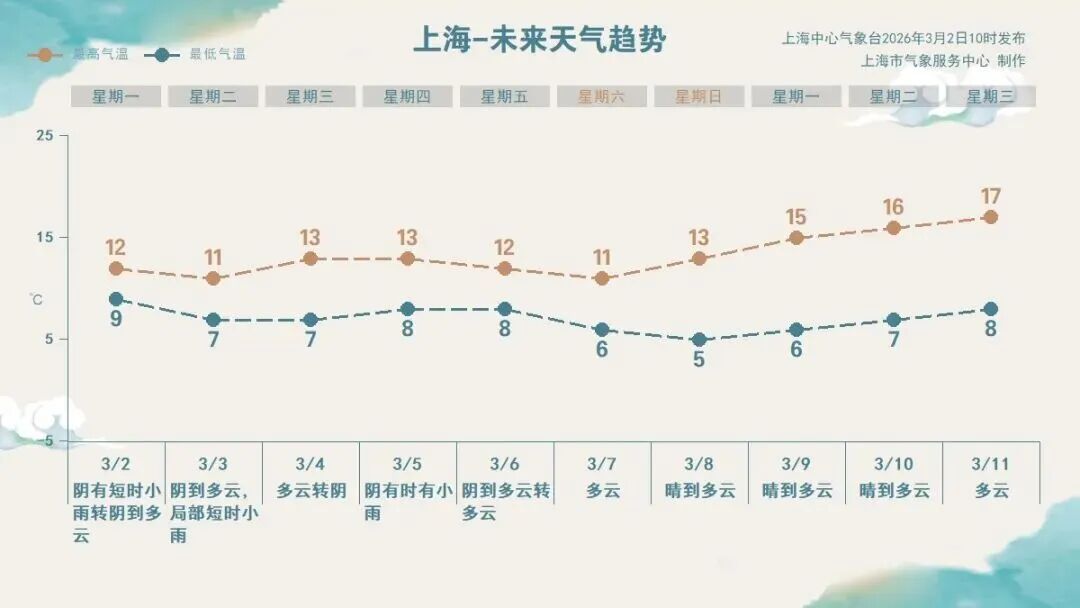 本周工作日上海天空云系总体较多,阳光属于“限量供应”。