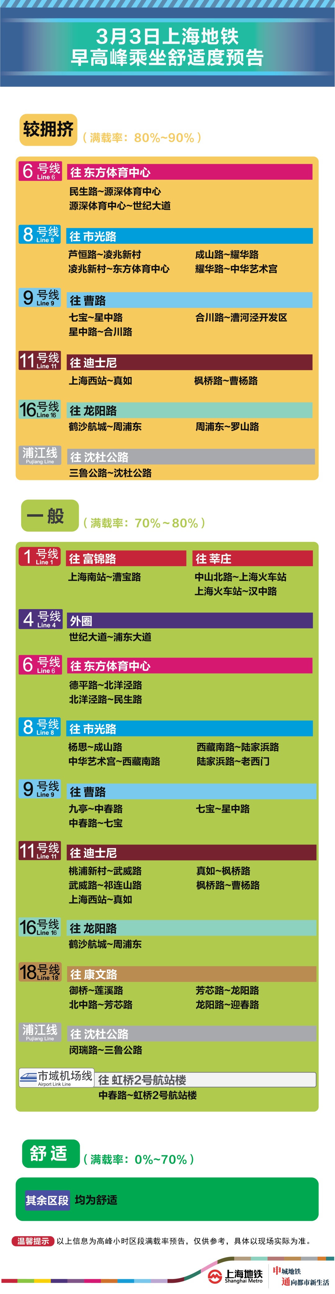 为提升上海地铁早高峰期间出行服务水平,提升乘客乘坐体验,上海地铁向乘客提供乘坐舒适度预告,方便乘客提