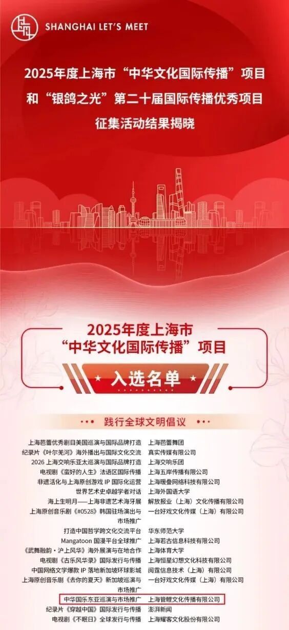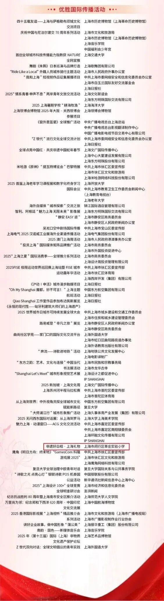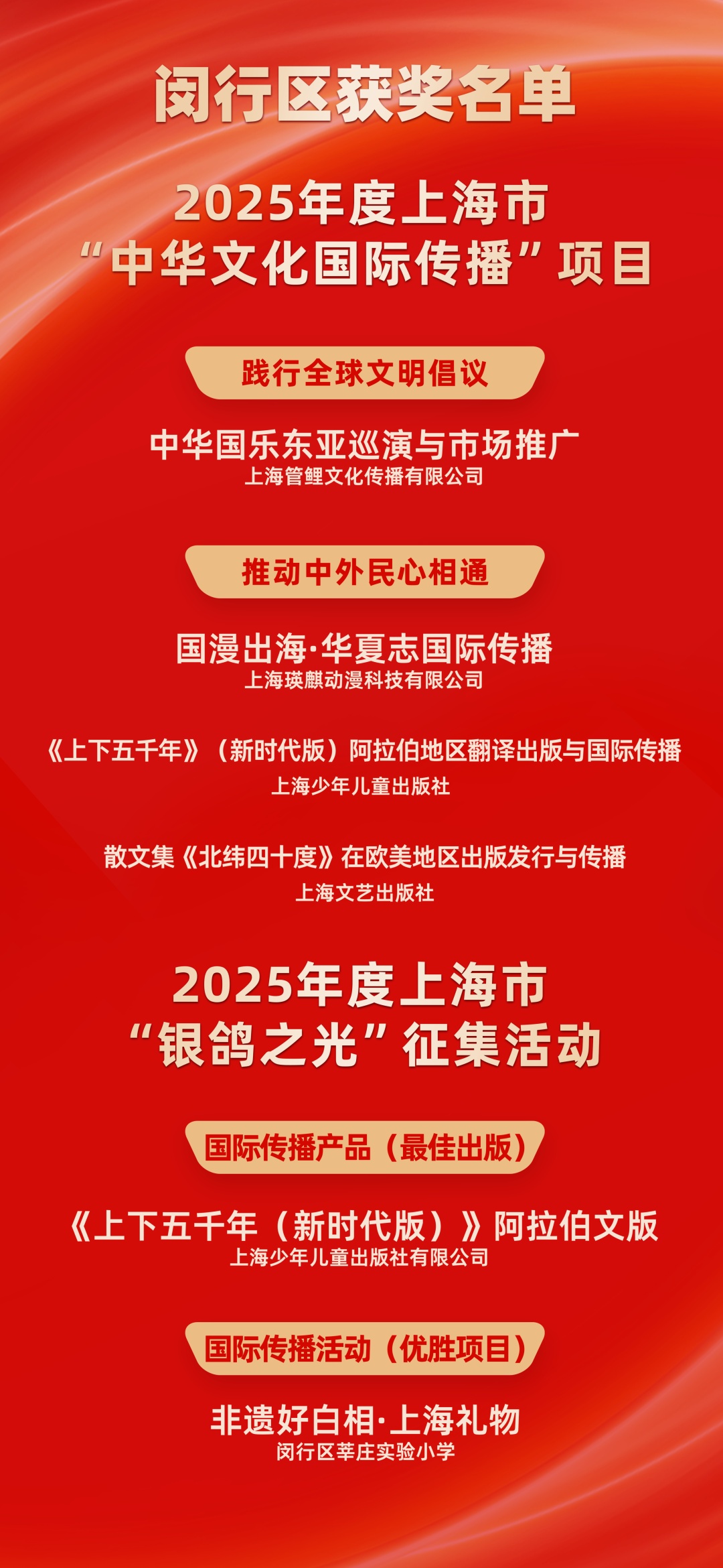 近日,2025年度上海市“中华文化国际传播”“银鸽之光”第二十届上海市国际传播优秀项目征集活动结果揭晓。经评委评审,57个项目入选“中华文化国际传播”项目;202件作品分获“银鸽之光”最佳项目和优胜项目。闵行摘得6个奖项,一起来看看~