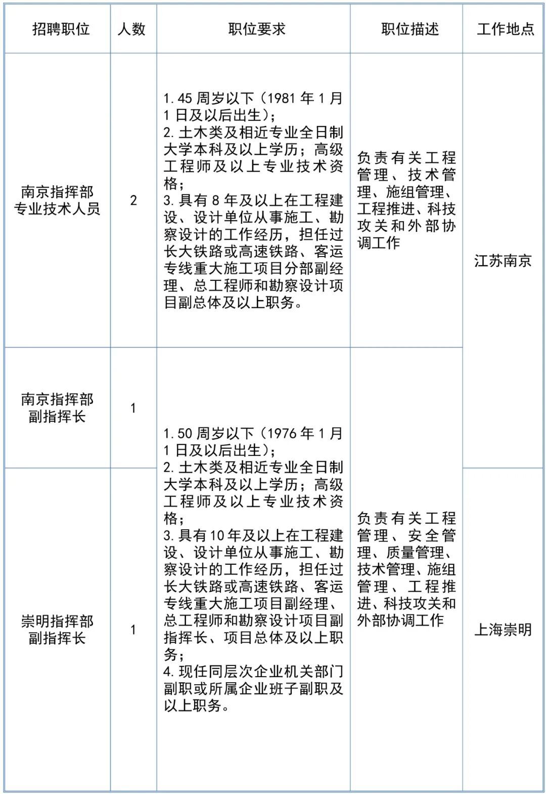 上海国铁工程建设管理有限公司(以下简称“上海国铁建管公司”)是中国国家铁路集团有限公司所属的合资铁路公司,现主要承担沪渝蓉高铁沪宁段、通苏嘉甬高铁、沪通二期、甬舟铁路主体工程建设任务。因工作需要,现面向社会诚聘工程建设相关专业管理人才,具体情况如下: