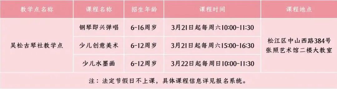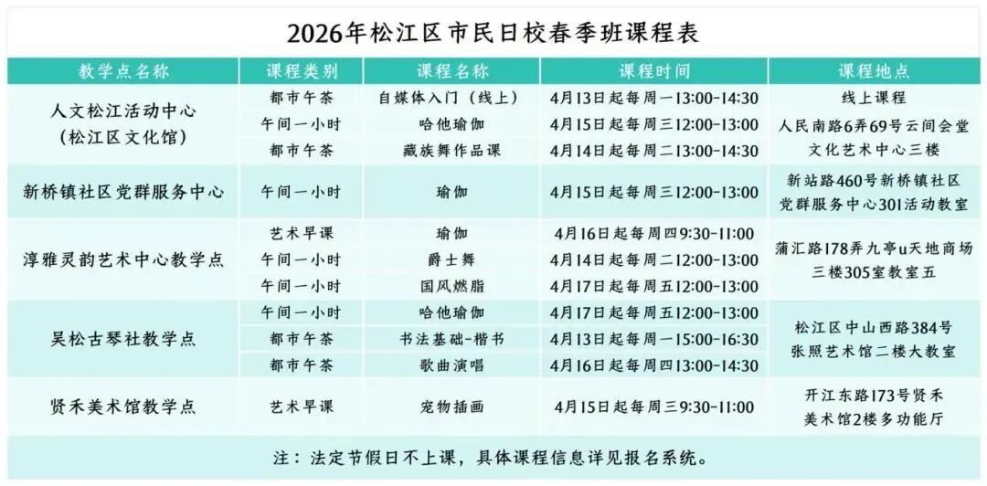 本期春季班规模进一步扩大,除了市群艺馆总校之外,同步推出浦东、黄浦、静安、徐汇、长宁、普陀、宝山、松江、青浦、奉贤等16个区共78个教学点,开设230门精彩课程。松江区的课程如下: