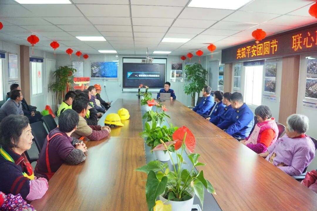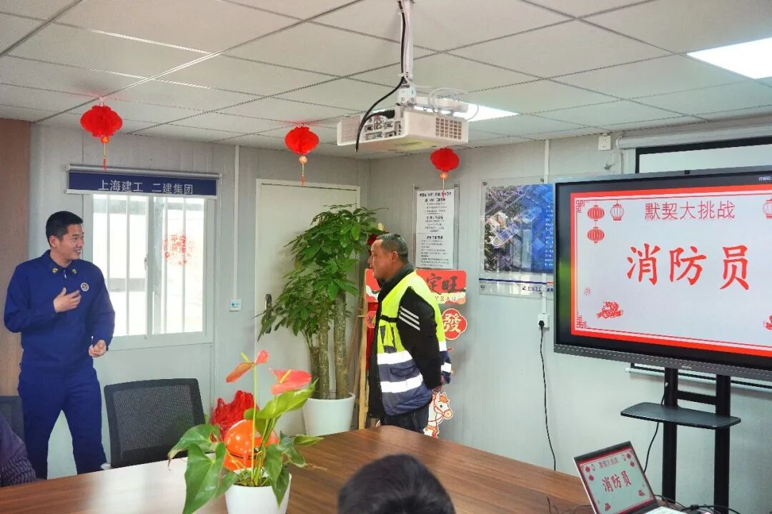 吃完汤圆,移步会议室,屋顶悬挂的红灯笼与电子屏上“共筑平安团圆节”的标语交相辉映,节日氛围浓郁。一场别开生面的“你划我猜”趣味游戏开始了。“火焰蓝”与“钢筋灰”们自由组队,围绕“安全帽”“赏花灯”等词语“手舞足蹈”地比画起来,滑稽的动作引来满堂喝彩,在欢声笑语中拉近了彼此的距离。