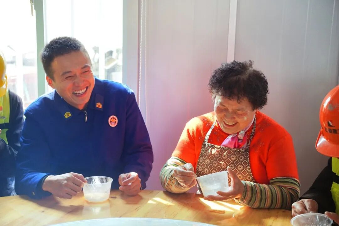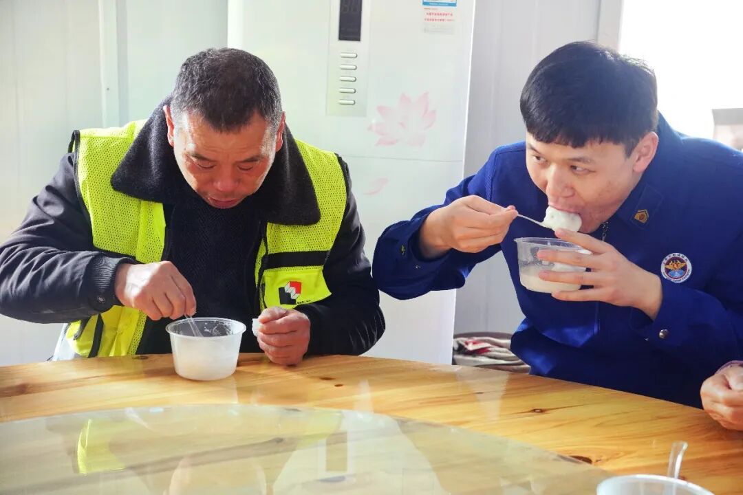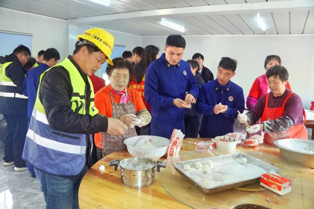 很快,热腾腾的汤圆出锅了,大家围坐一堂,共品佳节味道。来自绍兴的钢筋工章文波咬了一口鲜肉汤圆,满意地说:“太鲜了!这是我第一次在外面过元宵节,没想到比在家里还热闹、还温暖!”一口热汤下肚,他脸上洋溢着幸福的笑容。