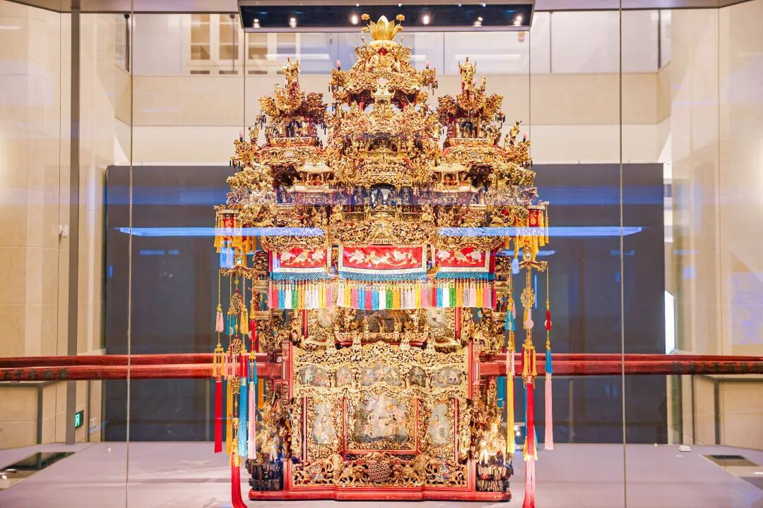 博物馆里还有一件镇馆之宝——高达2.8米的“物华号百子大礼轿”,耗时十年雕刻,轿上刻满故事:狄青与双阳公主、穆桂英与杨宗保……百子图案不只是“多子多孙”,更藏着“长寿、富贵、安乐、善终、子孙多”的“五福俱全”的人生理想。这顶轿子饱含了老一代人对一个家庭最圆满的想象——既有琴棋书画的诗意,又有柴米油盐的温情。在百年文物前盟誓,也祝福所有新人的日子如这顶花轿般,雕梁画栋,繁华似锦。