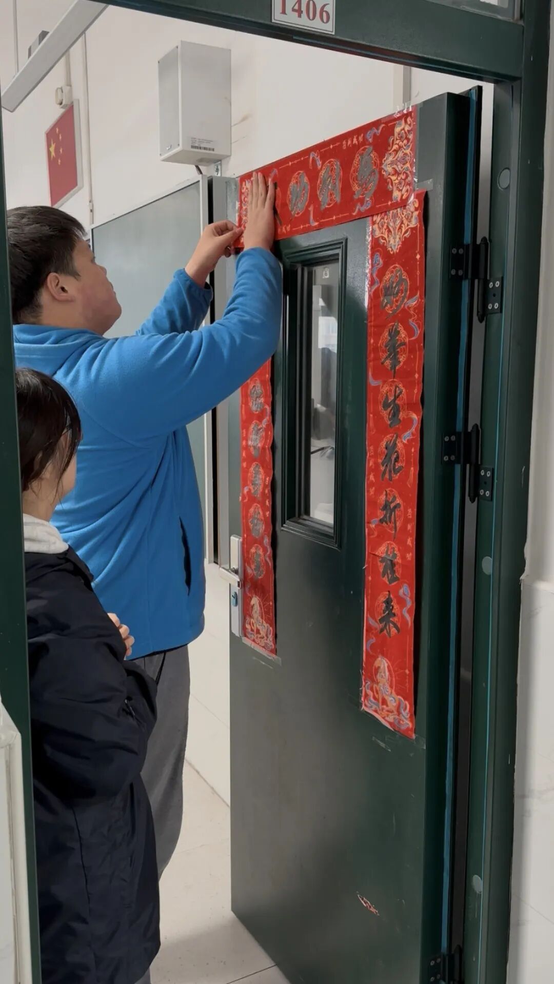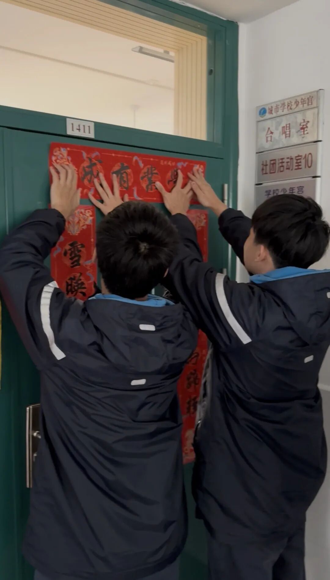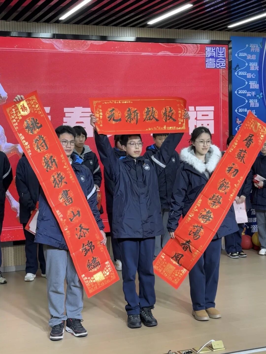 沪新中学写春联、送祝福活动,至今已连续举办十九年。开学典礼结束后,各班教室门口,处处可见师生忙碌张贴春联的身影。这些春联全部由学生亲笔书写,一笔一画寄托着对同窗的美好祝愿。