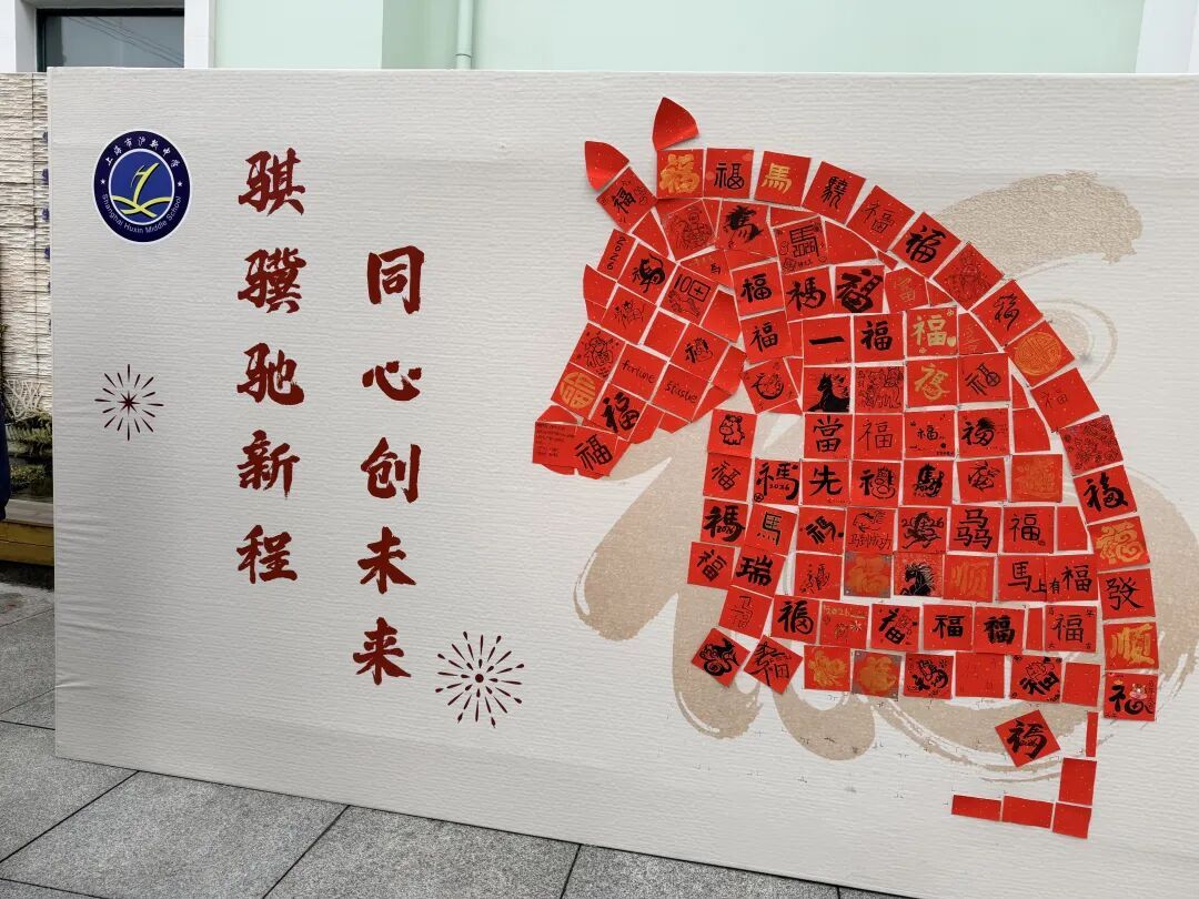 新春元素必不可少。共创红红火火、福气满满的“百骏图”,写春联、送祝福……开学首日,上海市沪新中学校园内一派红火喜庆。
