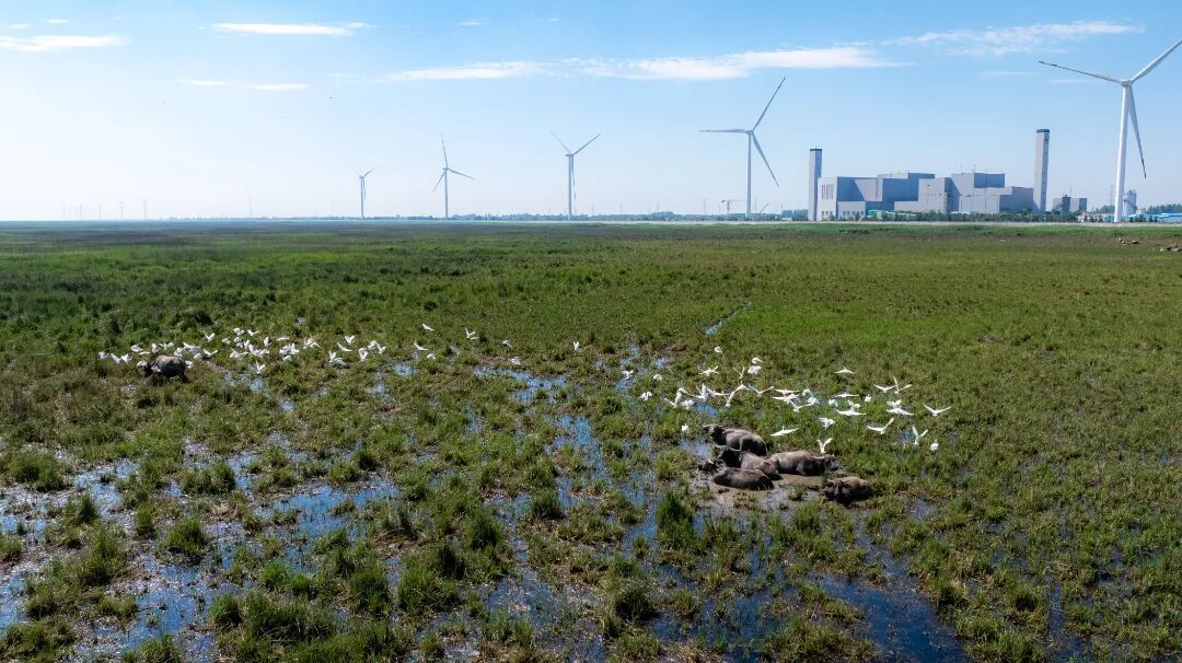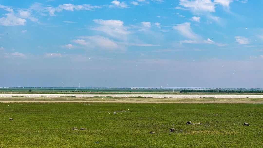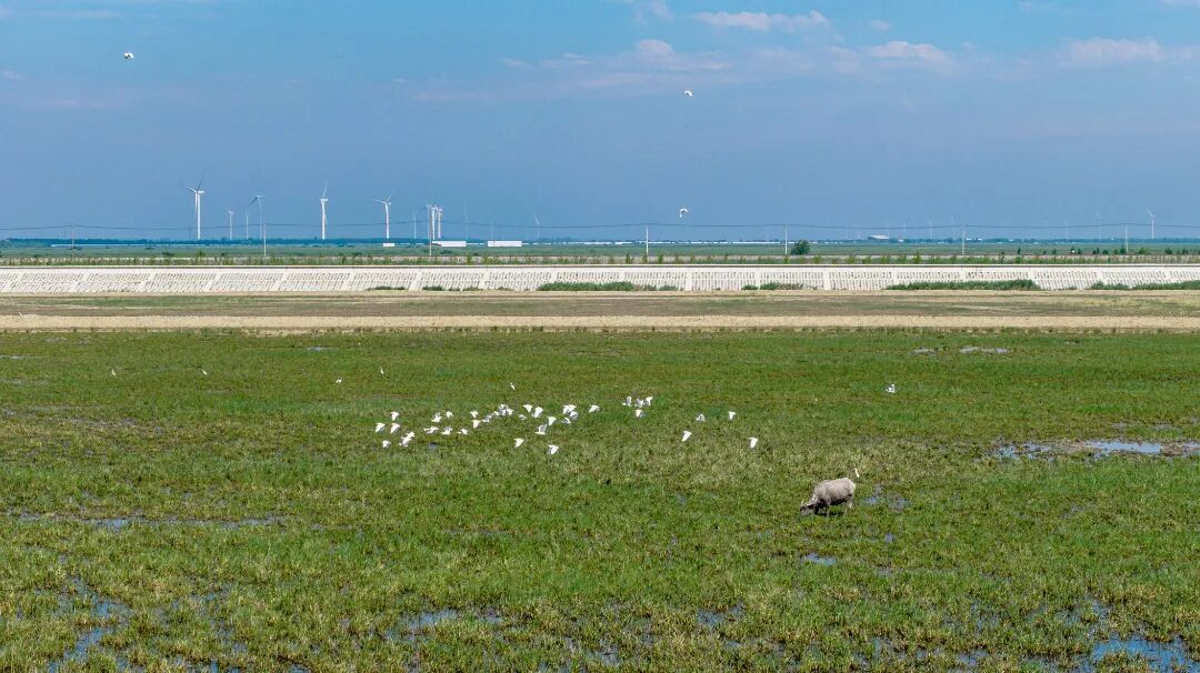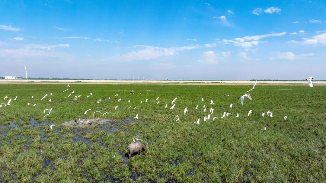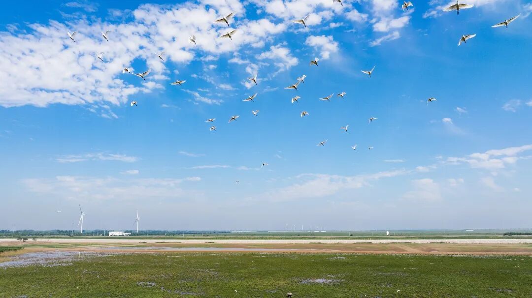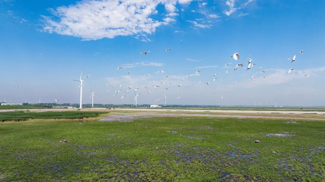2024年8月港沿镇沿江北部,蓝天白云,风车绿能,牛啃着草,白鹭相伴,一幅生态与发展和谐的画卷