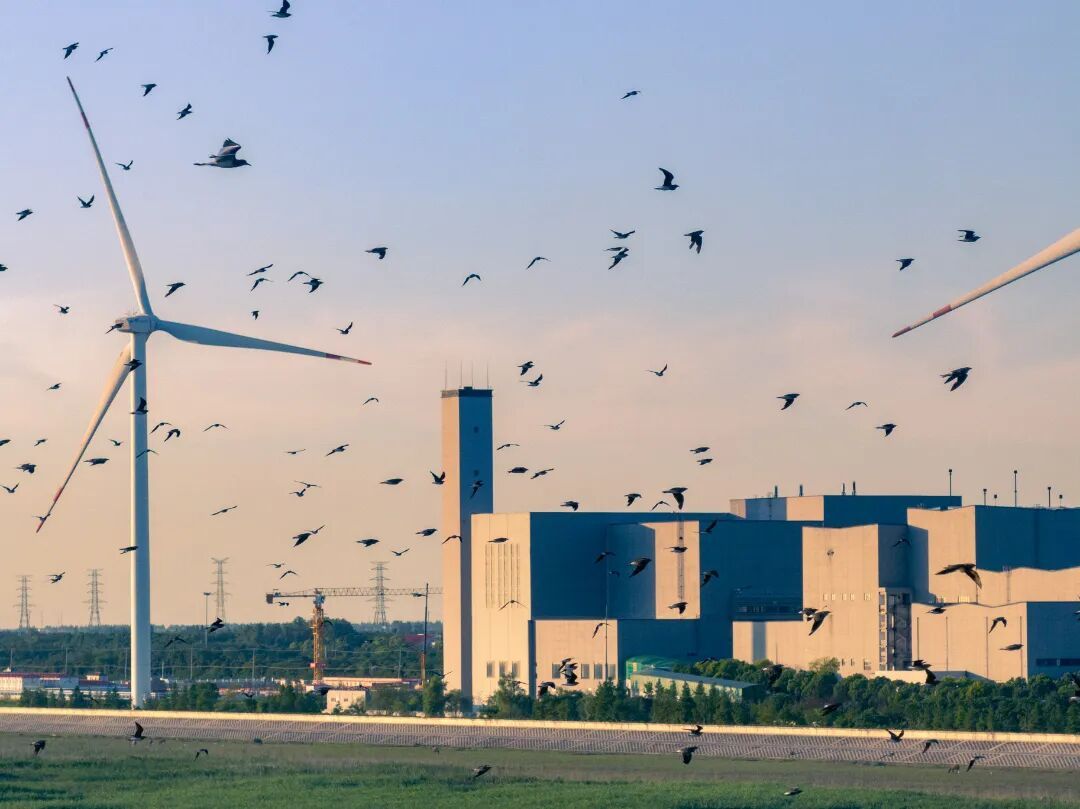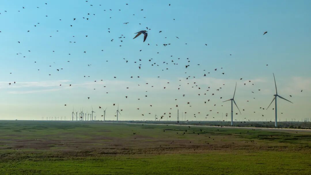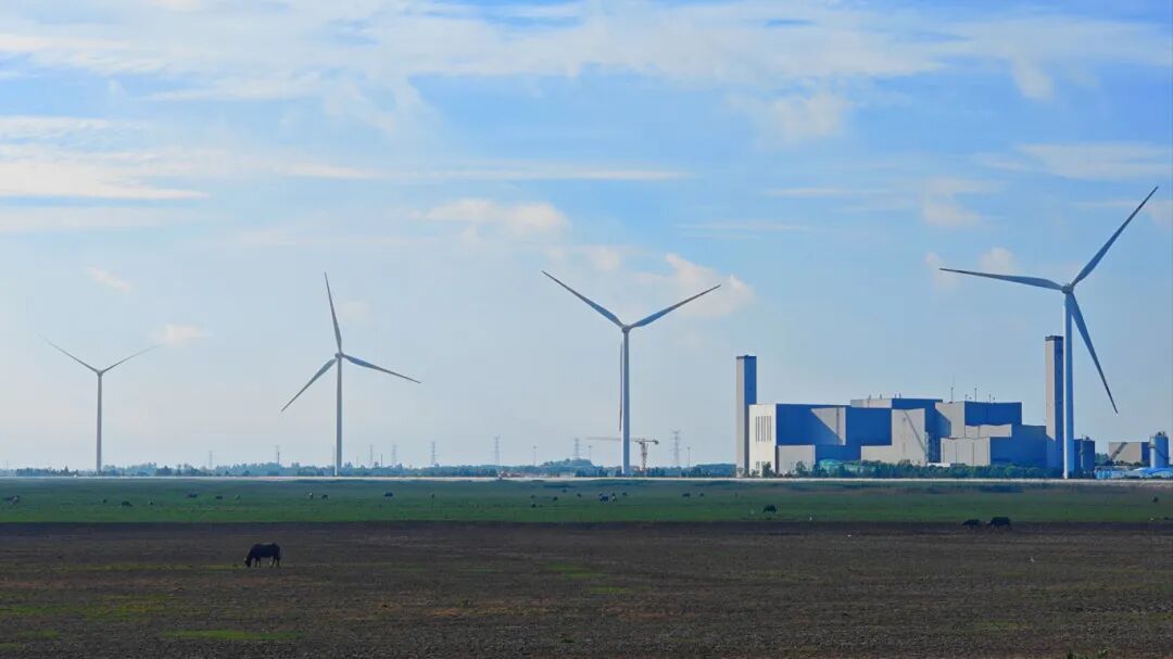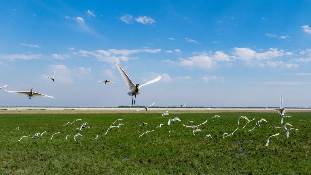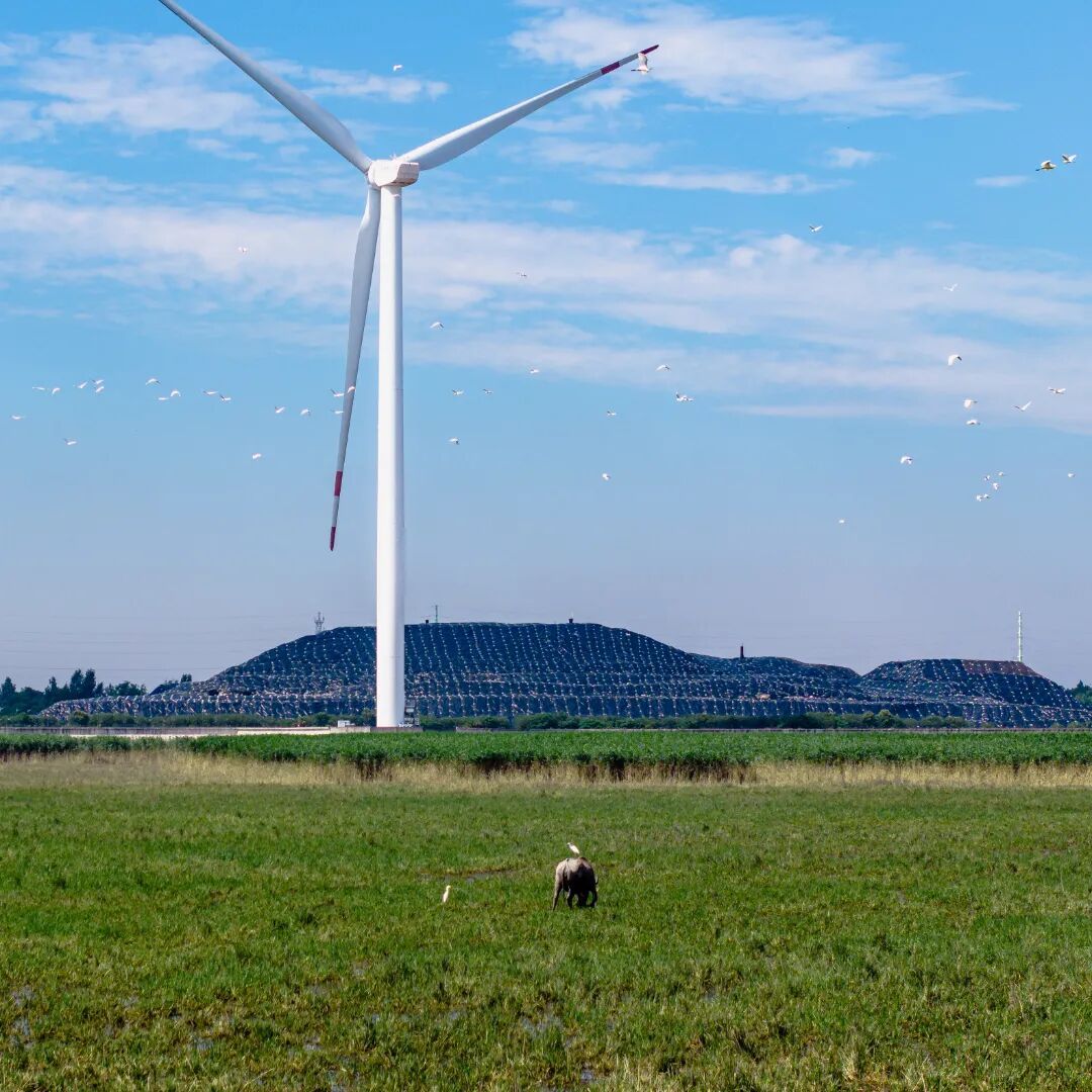 2024年8月港沿镇沿江北部,蓝天白云,风车绿能,牛啃着草,白鹭相伴,一幅生态与发展和谐的画卷