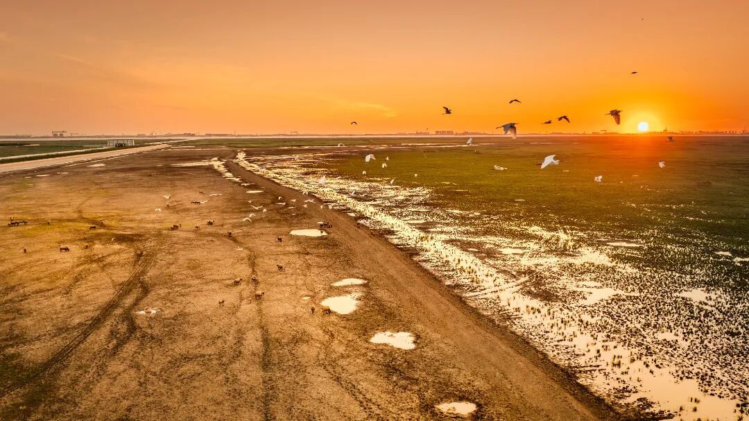 5点的天际,朝阳带着光辉跃出地平线,白鹭于湿地与天空间欢舞