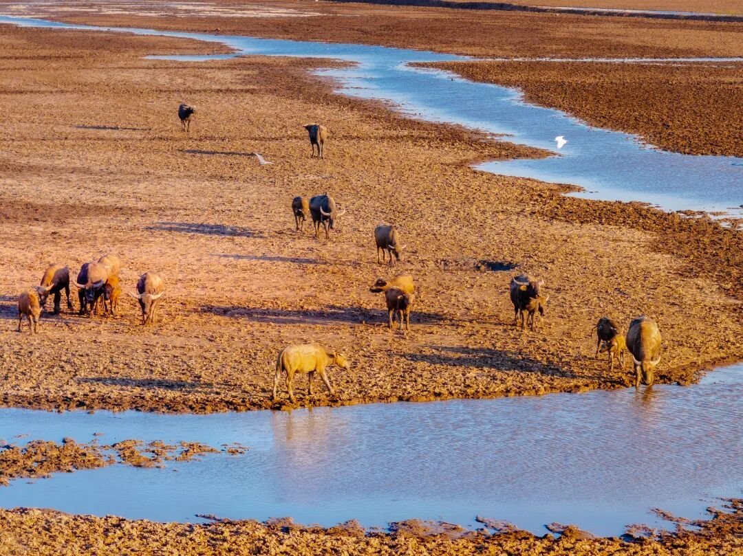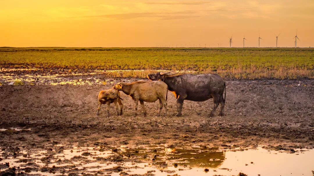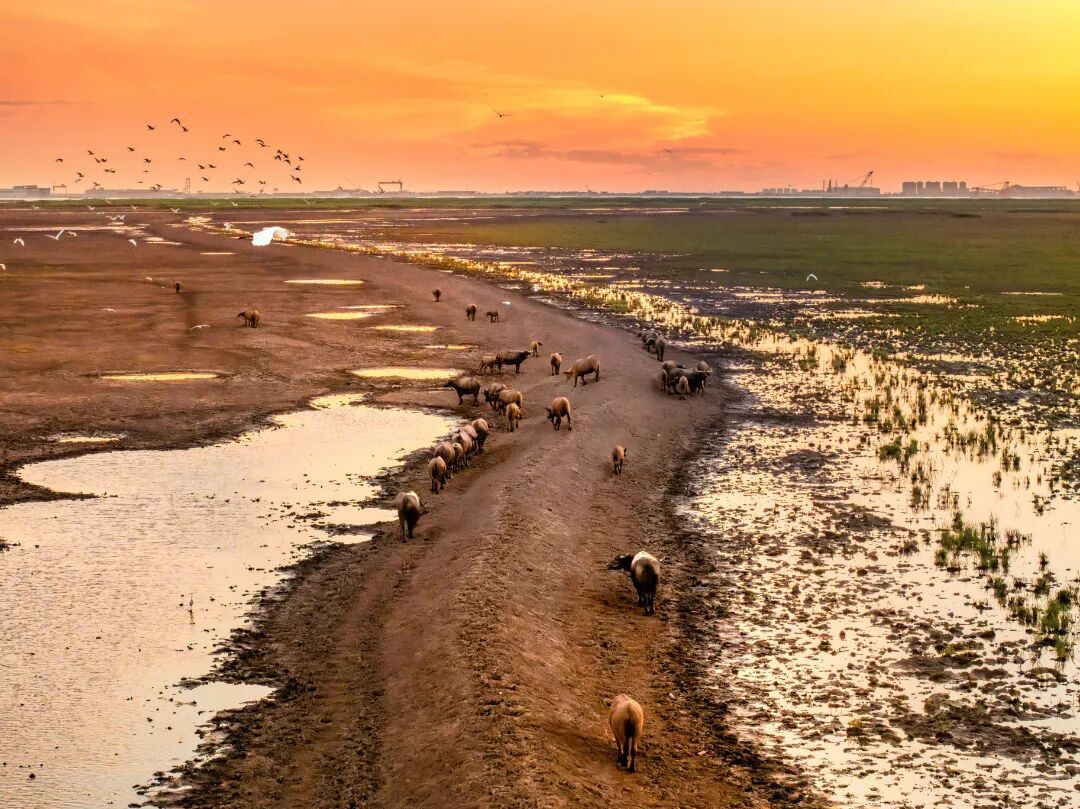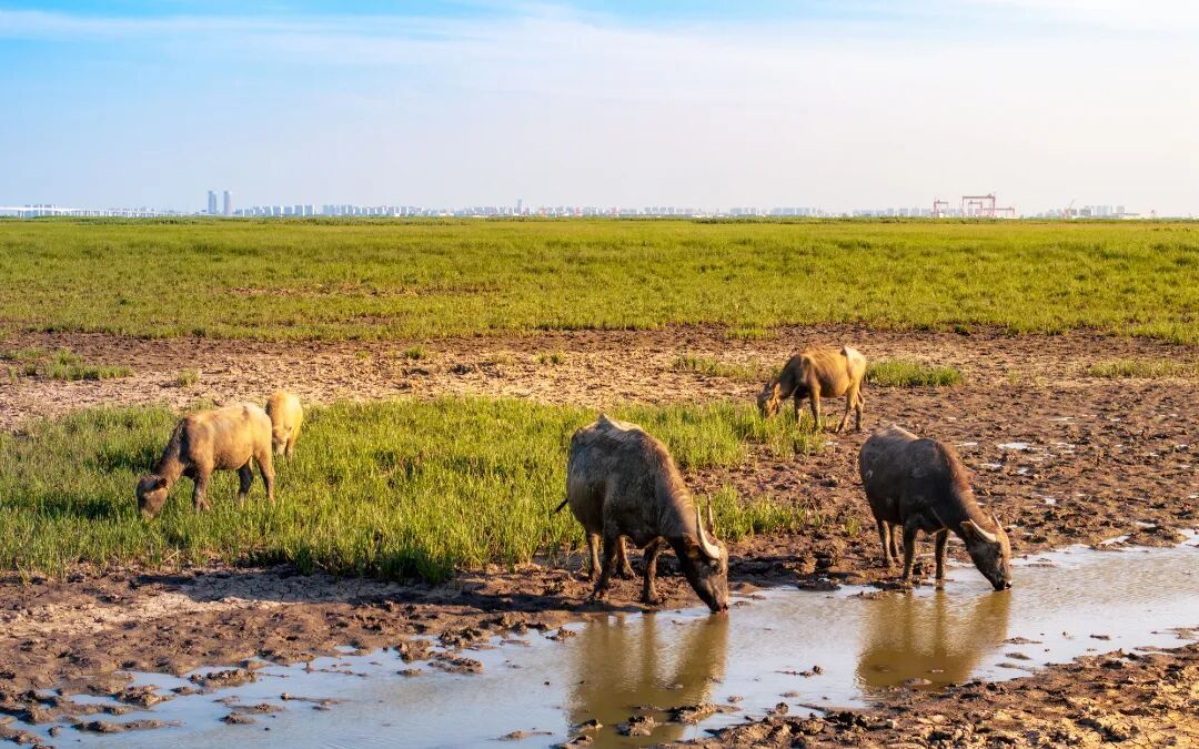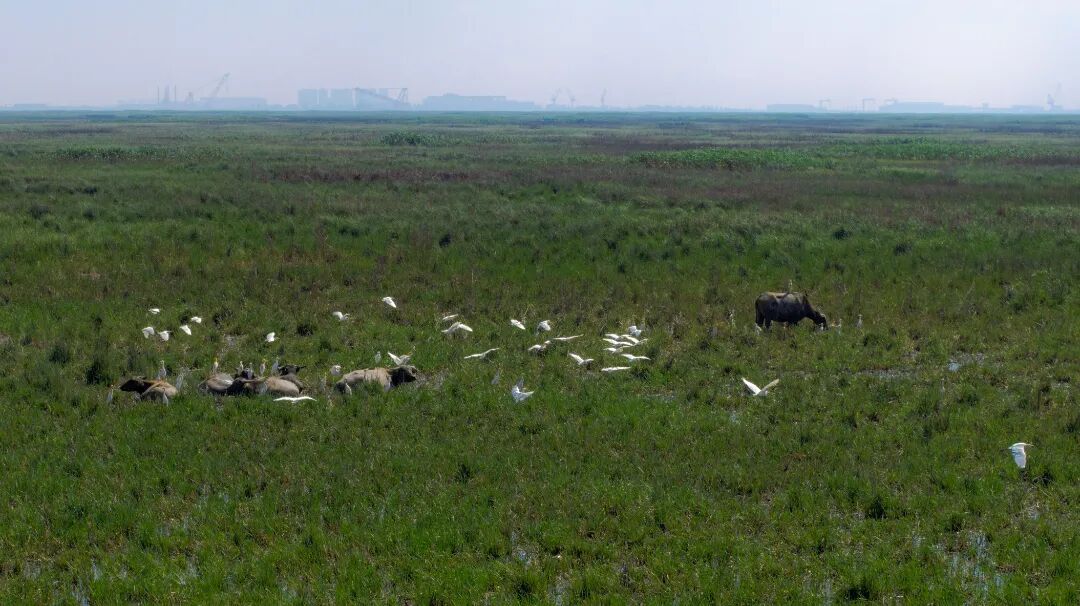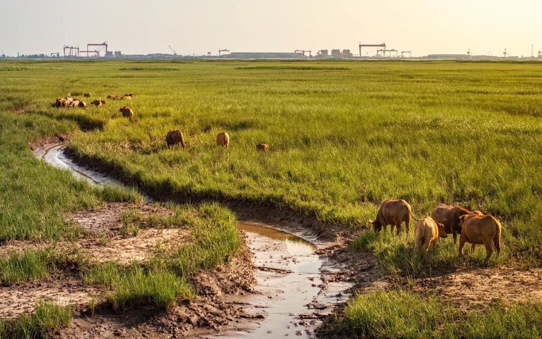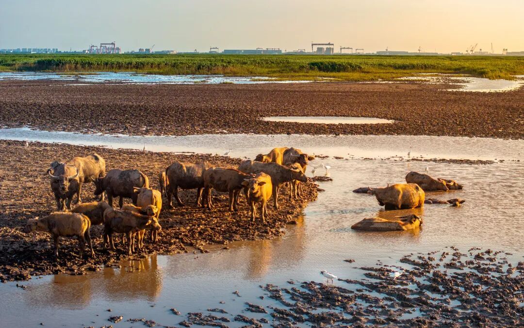 在堡镇港西侧,湿地上还有另一个牛家族,他们日出而觅,日落而栖