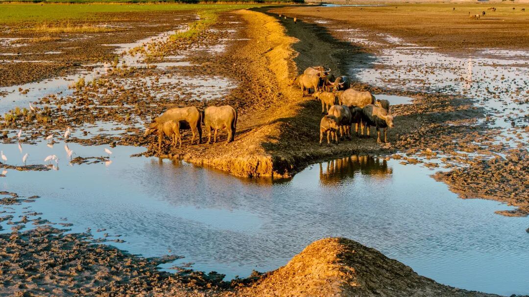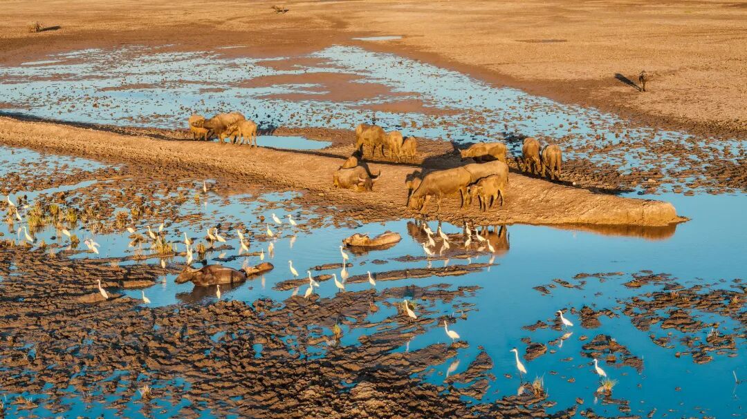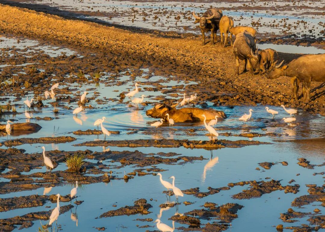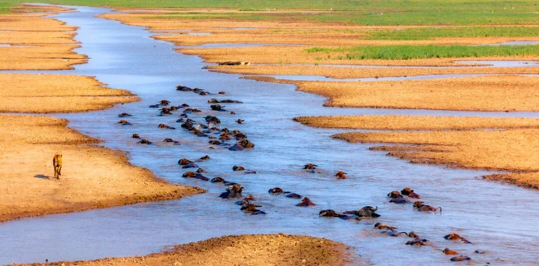 在金色光辉下,牛群开始踏上旅途,路途中有不少雨季遗留下来的淡水坑