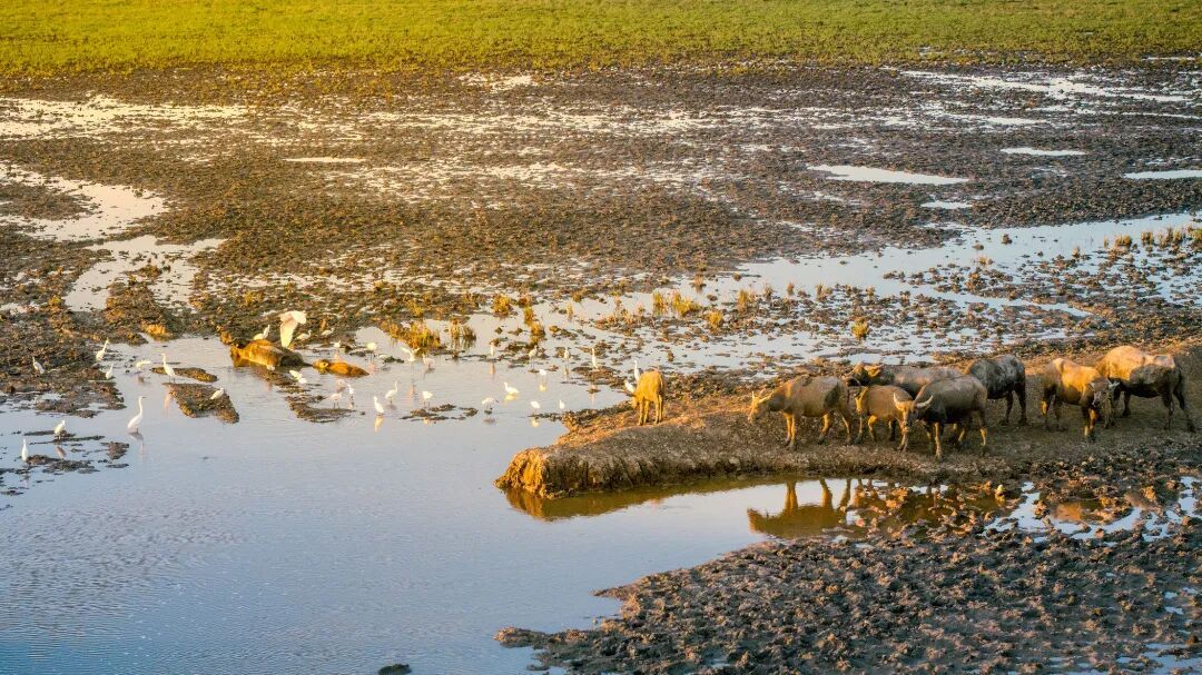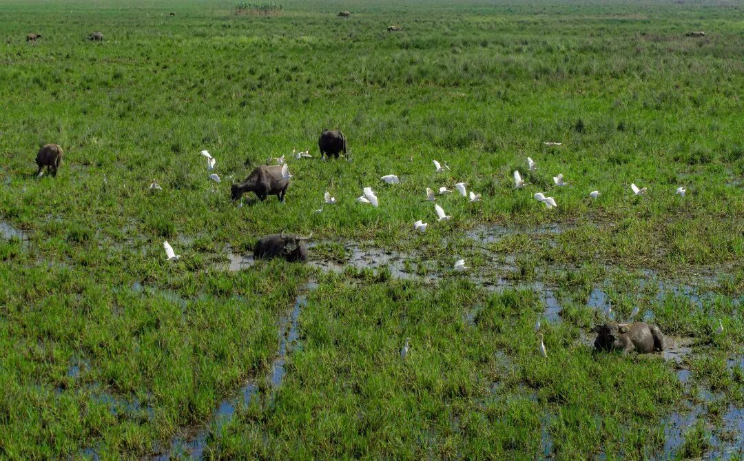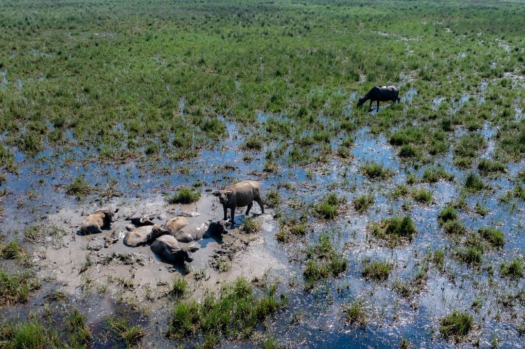 牛牛们沿着湿地河流脉络,慢慢消失于绿野中