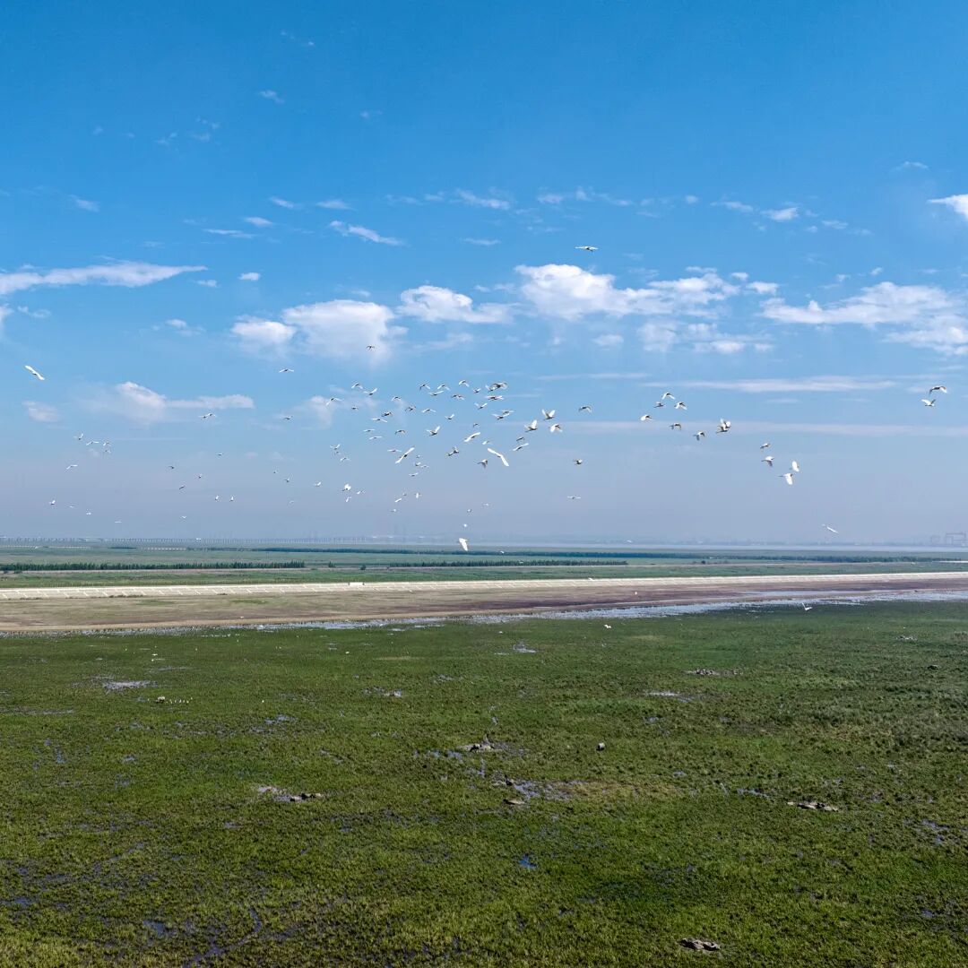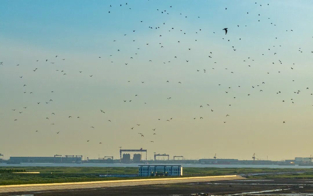 鸟群在上空飞行,地面是堡镇港水闸,长江对面是江苏南通