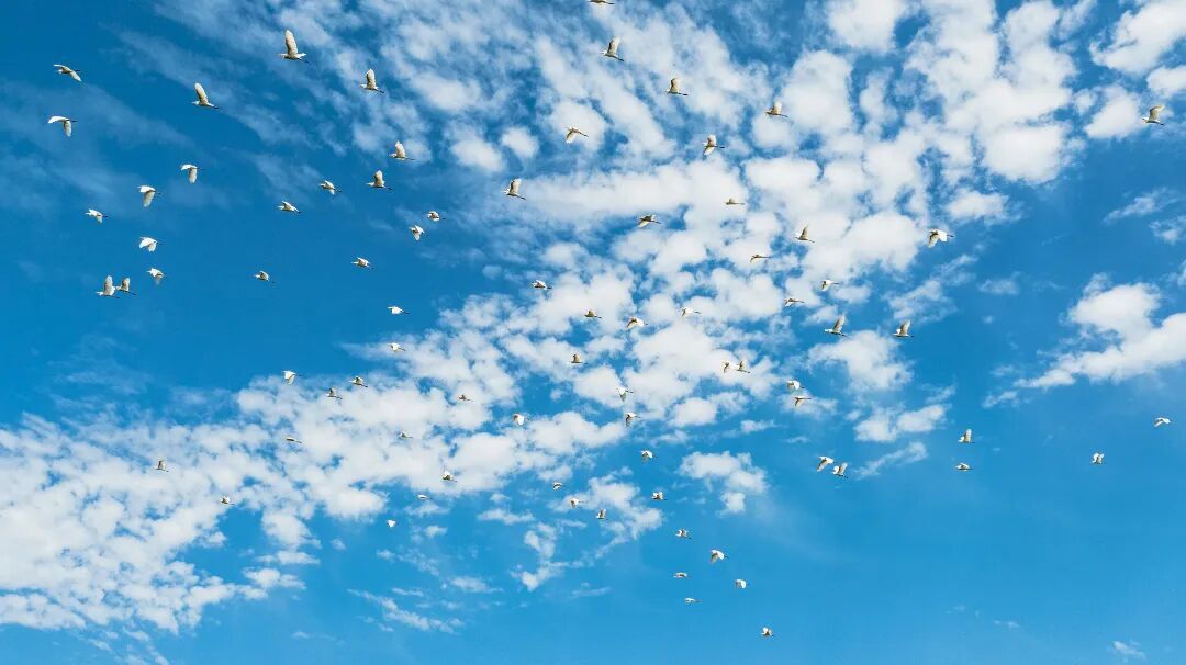 牛背上的白鹭,像是在指挥着天上一群鹭孩子