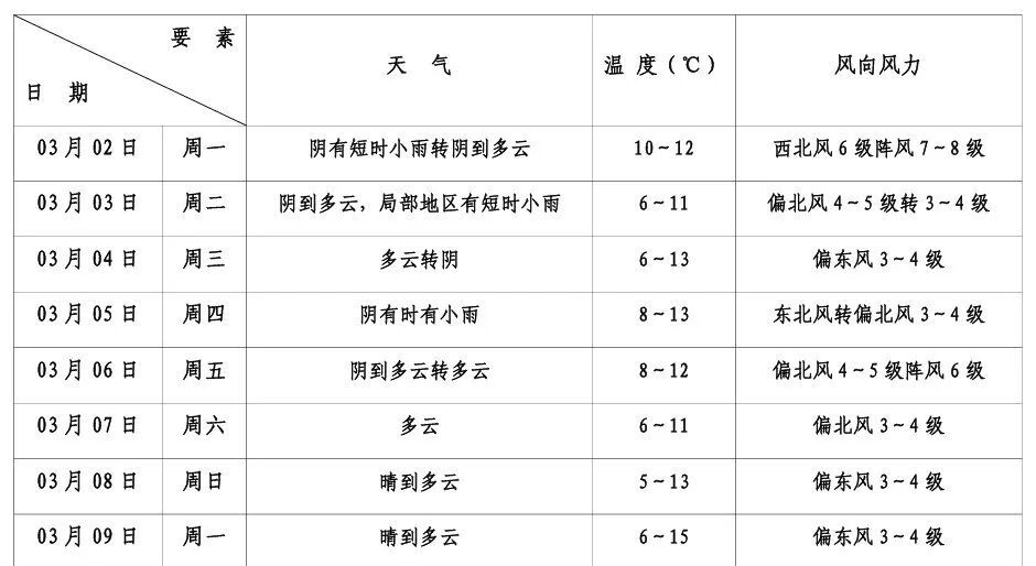 阴到多云,局部地区有零星小雨。西北风6级阵风7~8级,沿江沿海地区7级阵风8~9级,今天半夜转偏北风4~5级阵风6级,沿江沿海地区5级阵风6~7级,明天白天风力进一步减小,相对湿度85%~65%,气温在6~11℃。