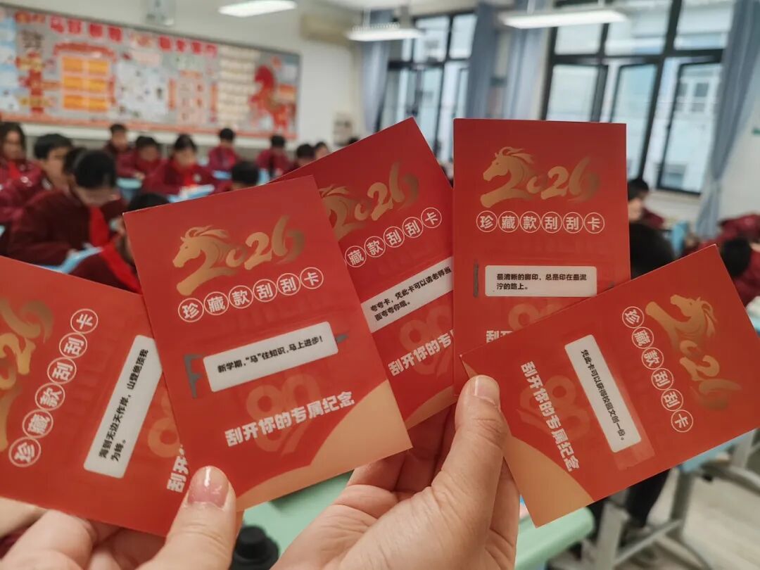 当然最令同学们兴奋的,还得属人手一份的特别惊喜——一张80周年专属限定刮刮卡。随着工具刮过卡面,祝福语跃然而出:“新学期,‘码’住知识,马上进步!”“海到无边天作岸,山登绝顶我为峰。”学校的激励给同学们的新学期补充着能量。“夸夸卡,凭此卡可以请老师当面夸夸你!”“凭此卡获得校园文创一份!”还有的同学还刮出了“隐藏款”,乐开了花。