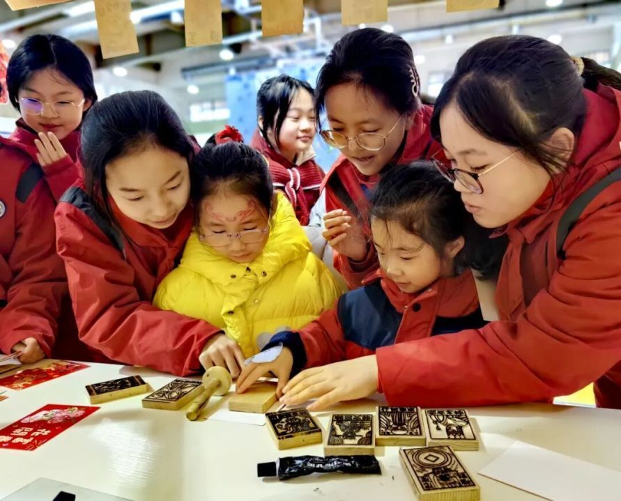 “来,拉好我的手,我们一起去游园!”走进上海市建平实验张江中学,仿佛一脚踏进欢乐的海洋。同在环科路上的翡翠社区学校教育联盟三校联手举办元宵游园会,“隔壁邻居”万科实验小学的全体五年级学生和万科实验幼儿园的大班幼儿一起来“串门”。“东道主”哥哥姐姐陪着弟弟妹妹,一同在中学校园里玩彩绘脸谱、学非遗漆扇,齐心协力猜灯谜、拓吉印,现场一片欢声笑语。“这里比幼儿园还好玩!”大班幼儿“小花生”拉着“哥哥”的手,决心要把15个印章都集齐:“为新学期开个好头!”