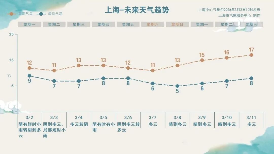 今日(3月2日)申城阴天开场,雨水有所减弱,降雨以短时小雨为主,夜里彻底雨止。受冷空气扩散影响,本市风力有所增大,全天气温在9~12℃之间,相对湿度95%~75%,出行注意防风保暖。