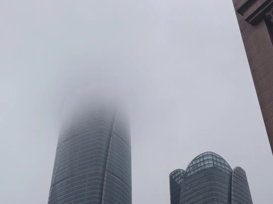 今日申城乌云连绵,遮蔽日光,高楼半腰以上隐没在雾中,天空时不时降下细细雨点。