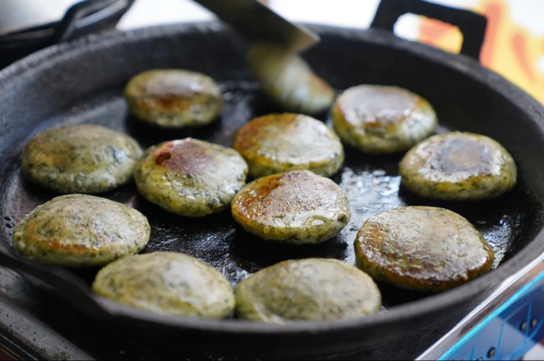 如果想吃点不一样的,可以试试古镇吴阿姨特色小吃店的草头塌饼。这可不是普通的塌饼,它有馅!用纯糯米粉和新鲜草头制作,分咸甜两种(鲜肉、红枣、豆沙、黑芝麻),外脆内糯,散发着草头的清香。如今店里由吴阿姨的儿子“塌饼侠”掌勺,坚持复刻“母亲的味道”。