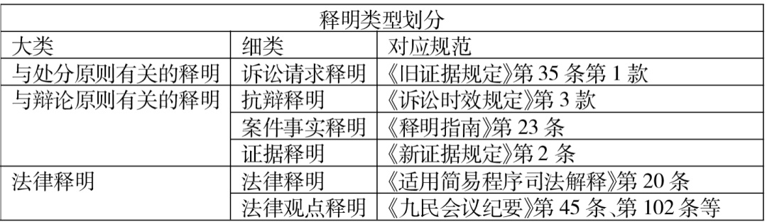 一是诉讼请求释明。诉讼请求释明包括释明增加诉讼请求,释明追加当事人或第三人,释明变更当事人或第三人,释明变更诉讼请求,释明以明确诉讼请求,释明提起反诉。对于能否进行增加诉讼请求的释明,采取实质判断标准,对无法通过实质解释纳入原诉讼请求范围的,应进行释明,当事人拒绝增加的,判决驳回。对于变更当事人的释明,常见的为被告是否适格的释明,审理过程中可以对被告适格释明,释明后仍拒绝变更,判决驳回。对于反诉的释明,应认可提起反诉的释明,不过应当注意当事人可选择另案处理。对于是否释明追加当事人或第三人,应以纠纷一次性解决为导向,进行释明,不过在释明后选择权在于当事人。二是抗辩的释明。主要应当关注其中的抗辩事实抗辩与抗辩权抗辩,能够根本上否定当事人请求权效力的是抗辩事实抗辩,仅是阻碍请求权实现的是抗辩权抗辩。对于事实抗辩,基于应当主动援引的要求,应当进行释明,对于权利抗辩,根据上述释明限度要求,在当事人未主张时,不能进行释明,在其已经提出构成要件基本事实时,不过由于诉讼能力而未予以明晰时才能释明。三是案件事实释明。对于案件事实释明应当坚持不违反辩论原则和法官中立原则,并且应当遵循释明的限度。在当事人主张的诉讼请求和相应事实已经可能指向某个请求权基础,但是由于法律知识或诉讼经验的缺乏,可能遗漏了某部分事实的情况下,此时,法院应当进行释明,以弥补当事人事实主张之不足。四是证据释明。证据释明包含证明责任释明,质证释明,提出证据释明,心证释明。对于具体证据未予释明,应当认为并不构成程序违法,对于心证释明,法院结合具体情况应当进行释明,对于证明责任分配的释明,应当认为未进行释明的情况下并不构成程序违法。五是法律释明与法律观点释明。法律释明与法律观点释明两者具有不同的适用条件,与不同的立法目的,不过两者均涉及法律问题的解释说明。前者是为了弥补当事人法律知识的不足,在适用条件上以当事人的个人素质为前提,针对的是抽象的诉讼参与人,比如民诉法中规定判决中应当注明当事人的上诉权利、期限、上诉法院,这些“法律知识”的释明均不以当事人明确不知晓为前提。而法律观点释明的规范目的是在具体案件中避免突袭裁判,确保法律的正确适用,因此其适用条件以当事人主张的法律关系或行为效力与法院认定不一致为前提。为更好的适用释明制度,激活其链接当事人与法院沟通桥梁的重要作用,解决实践中不当释明等问题,应当建立完善的释明保障机制。