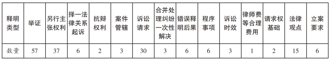 最高法院案例具有最广泛的示范效力,为了更为精准了解现今释明制度运用的方向,本文以最高法院涉及释明的案例为个案检视的目标,检索方法以“释明”为关键词,考虑到《新证据规定》正式施行时间为2020年5月1日,距今接近4年,基于可能的裁判惯性的考量,因此将搜索时间设定为“近三年”,同时文书中涉及释明的范围限缩于“本院认为”部分,检索数据库为法信网及中国裁判文书网。得到涉及释明的裁判文书共191份,其中判决书65份,裁定书126份。经过分析梳理,上述案例中,有52份文书并不涉及释明问题,可分为如下情形:一是全文中无释明字样,而是出现诸如“司法解释明确规定了”的语句,如(2023)最高法民申729号、(2021)最高法知民终1801号;二是释明实质上具有要求或者禁止的意义,如(2021)最高法民申6024号等。将52份文书去除之后,剩下139份文书,按照释明事项进行划分,见下表:由上表可知,在实际运用中,举证责任的释明在释明活动中存在感明显,这也与实践中法官运用释明工具时,经常对举证责任的释明程度感到困惑相匹配。通过释明让当事人另行主张权利的案例也较多,同时,通过释明让当事人明确诉讼请求也是释明的主要运用情境,除此之外庭前会议中释明法律观点,立案之时释明立案条件、管辖要求,以及庭审中释明法律观点、法律规定等也经常成为释明的对象。可见释明这一制度工具在实际运用中贯穿诉讼全过程,对于案件审理的推进以及解决具有不可替代的作用。另外,在这些文书中涉及再审审查的高达59件,足可见释明问题在再审审查中具有重大影响。需要重点关注的是对于不当释明的后果,其具体的后果并不明晰,这个问题也是当前法官,尤其是基层法院法官不敢运用释明制度的最大的原因,在最高法院层面,对于不释明、错误释明的后果,其观点也颇为来回不定。比如在对于不释明的后果,(2023)最高法民申147号案件中,最高法院认为不释明,构成程序瑕疵;在(2022)最高法民终192号案件中,最高法院认为未释明鉴定事项属于程序违法;在(2023)最高法民终45号案件中,最高法院则认为不释明,构成适用法律错误。对于错误释明的后果,在(2021)最高法知民终825号案件中,最高法院认为错误释明构成法律适用错误,应发回重审。但在(2021)最高法知民终2375号案件中,最高法院则认为“释明另行起诉程序欠妥当,但不构成严重违反法定程序,本院可不将本案发回重审,直接审理后相应作出判决”。以上种种来回不定的结论,显然不利于释明制度发挥其沟通当事人和法院桥梁的作用,理应得到重视。综合释明的制度体系和实践运用,可知当前释明制度缺少一般性规范,这使得其实操性并不充足,现今的民事活动中对释明的运用并不充足,具体来看则存在如下三大问题:一是释明性质认识不清晰。对释明制度性质的认识是明确释明范围、使该制度具备更强可操作性的基础。但是从上述梳理可知,当前的实证法,并未对释明性质进行明确。唯有最高法院在具体案件的裁判中进行了简单明示,认为释明并非法院的义务。若认为释明并非义务,则释明被纳入自由裁量的范围,即便不行使也不构成程序违法,自然也无救济措施的存在空间。但是从上述规定中诸多“应当”的表述,显然又具有强烈的义务性质。如此,便使得在当前的规范体系下,释明性质仍旧悬而未决,亟待予以明晰。二是释明的范围不够明确。释明制度一般性规定的缺失使得释明范围悬而未决。需要追问的是释明针对的对象究竟为何?在具体操作中如何把握其释明的条件、方式以及程度?从上述规范及案例可以看出,当前对于释明对象的认识并不明确。《九民纪要》规定了对抗辩的释明,但此处抗辩针对的是重大性要件的认定,具有一定特殊性,对于一般性的抗辩能否释明,以及抗辩权能否释明,具体又应当如何操作?在《新证据规定》颁布实施后,法院应将与当事人意见不一致的事实作为焦点问题进行审理,这与《旧证据规定》要求释明变更诉讼请求完全不同,但是此处并未明确是否需要释明以及具体的操作方式。法律观点属于法官自由心证范围,在具体实践中是否应当向当事人释明,以及把握何种程度才能不偏离中立原则?此外,证据释明,案件事实释明等等,均需要进行更具有深度的探索,如此才能使得释明制度更具有可操作性。三是释明的保障机制不足。一般性规定的缺失也造成保障机制薄弱。首先,在法院消极释明,甚至过度释明之时,诉讼当事人的权益遭到损害,此时应当采纳何种救济方式,以弥补当事人权益的不足?当前的规范并不存在直接指向的救济措施。同时,应当看到当前释明体系对于当事人的约束并不强力,也即对于释明异议的处理机制并不充足,这可能使得当事人动辄以未进行释明为理由上诉甚至再审,进而对审理法官造成沉重负担,如此应当采用何种方式固定释明的过程及内容?以及应当建立何种释明异议的处理机制?这些问题的解决指向的均是释明保障机制的建构。释明被称为“民事诉讼大宪章”,对于法官责任制的落实具有关键作用。当前实践中存在上述问题的根本原因在于对释明的性质认识不明晰。作为释明制度研究的基础,明晰基本性质有助于清楚划定释明范围,并建构起符合司法公正要求的释明保障机制。而要明晰释明的性质,首先需要准确认定释明的制度目的为何。