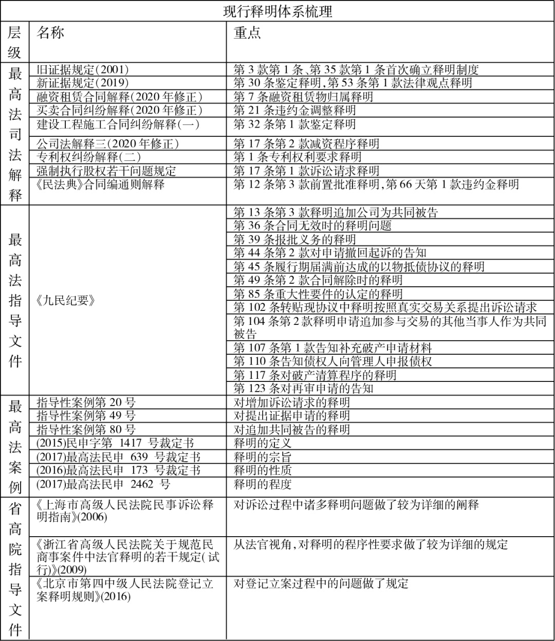 释明制度的规范体系已初步建立,但由于相关规范分散不一,以及一般性规范的缺失,释明的性质、范围、保障机制等方面仍旧未尽明晰,这使得释明的实际操作性不足,相应的制度价值并未完全体现。释明是诉讼程序处分原则和辩论原则的必要修正和补充,通过释明,能够使得当事人避免因为法律知识的不足而遭受程序上或者实体上的不利益。以《最高人民法院关于民事诉讼证据的若干规定》(法释〔2001〕33号,以下简称《旧证据规定》)为起点,通过司法解释、司法指导性文件、案例、各省级地方法院的司法文件,释明制度在我国逐渐发展。《旧证据规定》首次确立了我国法院释明制度。虽然其规范表述中未出现“释明”字样,但明确人民法院应当向当事人说明举证的要求及法律后果,并明确在诉讼过程中,当事人主张的法律关系的性质或者民事行为的效力与人民法院根据案件事实作出的认定不一致的,人民法院应当告知当事人可以变更诉讼请求。该规定一是以“应当”作为表述用词,将释明作为人民法院的义务,而非权利,即人民法院不能自由裁量是否实施该动作,而是在出现相应情况后,必须进行相应释明动作;二是仅对举证释明和诉讼请求释明作出规定,其他相应事项的释明尚有缺失。此后,《最高人民法院关于民事诉讼证据的若干规定》(法释〔2019〕19号,以下简称《新证据规定》)、《融资租赁解释》《买卖合同解释》《建设工程合同解释一》《公司法解释三》等分别就鉴定释明、诉讼请求释明、抗辩释明、判决释明、专利权利要求释明、违约金调整释明等作了规定。在司法指导文件上,《全国法院民商事审判工作会议纪要》(以下简称《九民纪要》)对释明进行了较为充分规定。在司法案例上,最高法院的一些指导性案例也对释明制度的补充完善作出了重大贡献。除此之外,在地方省级法院层面还专门就释明出台了一些指导性文件。上述这些规范及案例大致构成我国法院释明制度的基本框架,纵观这些规范及案例,在《新证据规定》之前颁布或者作出的均已经相对滞后,在其之后颁布或者作出的则缺少制度主线。