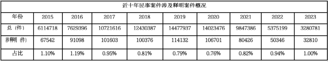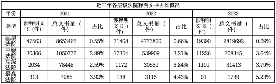 以年度统计,近十年在整体的民事诉讼活动中,涉及释明的文书数量占比情况如下:可见近十年其比重在1%左右徘徊,这与释明所能发挥的作用以及应当在整个民事活动中所具有的地位并不匹配。以法院层级进行统计,近三年,各层级法院涉及释明的文书占各自文书量的比重情况见下表:可以看出,三年来,与基层法院释明活动占比基本稳定情况不同,中级法院以上层级的法院释明活动虽然在比例上仍然偏低,但在变化态势上有所上升。可见在中级法院以上层级的审理活动中,释明在诉讼程序进行中的重要作用逐渐得到重视。