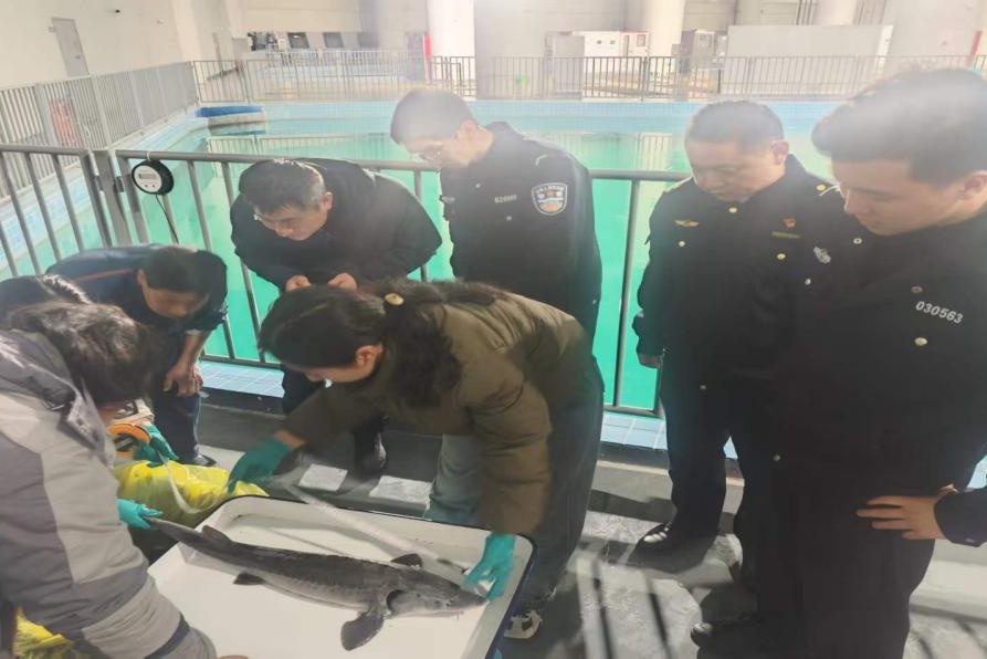 警情就是命令。值班民警闻令而动,迅速赶赴现场。昏暗的灯光下,两位民警凭借培训积累的野生动物识别知识,初步观察到该鱼体呈梭形、吻部弯月形、口下位、体表具有五行骨板——这极有可能是国家一级保护水生野生动物、被誉为“水中大熊猫”的中华鲟。“当时我们立即意识到这可能是一级保护动物,必须争分夺秒,确保它的安全。”民警回忆道。两位民警迅速按照水生野生动物保护应急预案,对鱼体采取临时性保护措施,确保不对其造成任何二次伤害,并第一时间将情况上报指挥中心,同步通报农业农村部门。