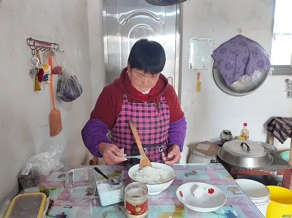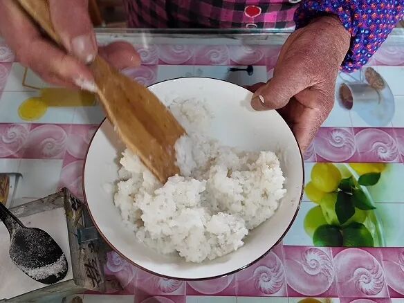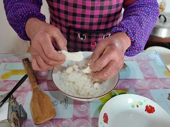 阿婆用手反复揉搓按压,直到糯米变得黏糯成团。过去农忙时节,田埂上的农人啃着粢饭糕,就能快速补充体力。这小小的粢饭糕,早已融入四团人的生活肌理,成为地域文化的鲜活载体。