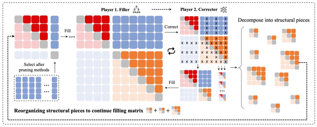 在合作博弈的框架下,这两个智能体共同探索如何更高效地进行矩阵填充游戏。每一轮游戏结束后,系统都会重新解构当前矩阵对应的几何结构,从庞杂的整体结构中提取出精炼的子结构,并将其用于下一轮游戏。通过这种“填充—修剪—解构—再填充”的协同机制,高维空间的探索难度被显著降低。原本高不可攀的数学难题被转化为一场有趣的“多智能体游戏”,并进一步成为可训练、可优化的人工智能任务。