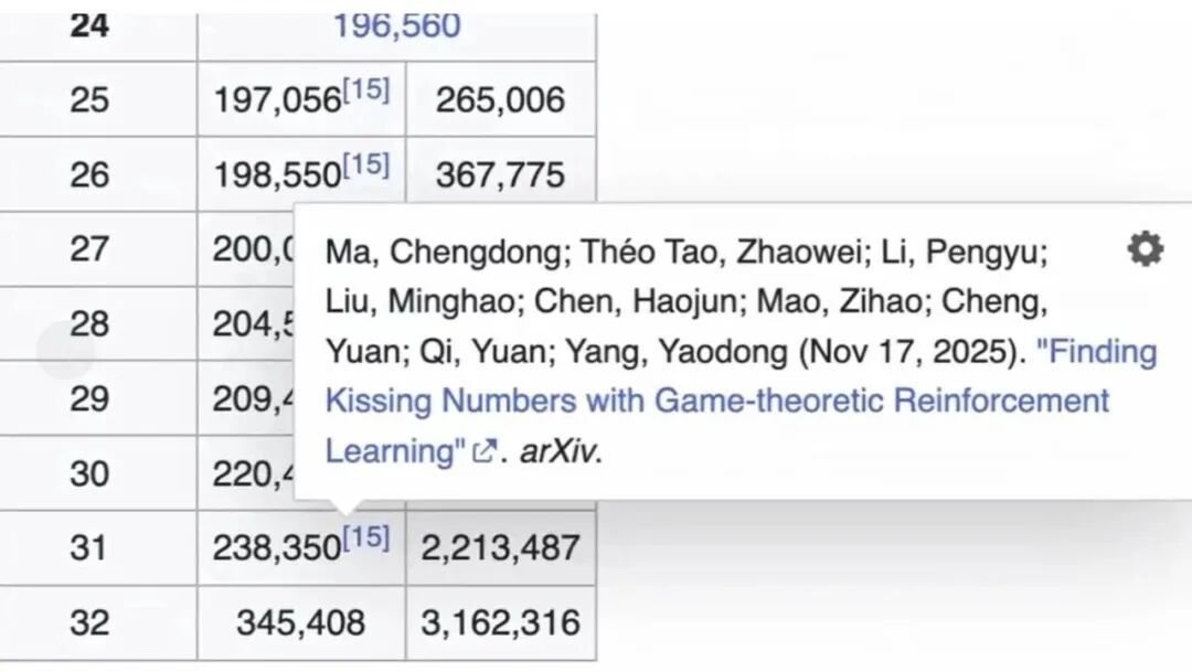 复旦大学、北京大学、上海科学智能研究院(以下简称“上智院”)组成的联合团队,通过自主研发的PackingStar强化学习系统,在12、13、14、17、20、21、25–31维等多个维度刷新亲吻数与广义亲吻数纪录,实现数学结构领域罕见的多维度、系统性突破。