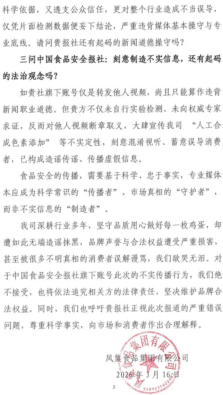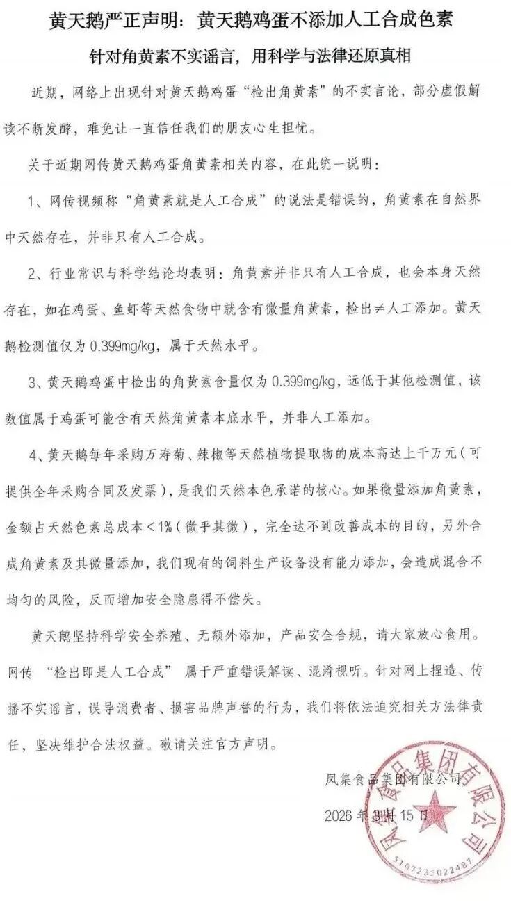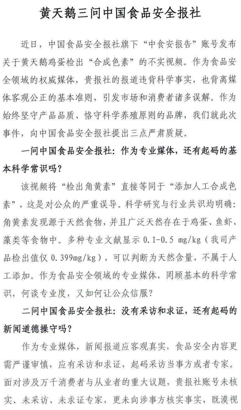 3月15日,黄天鹅向中国食品安全报社发律师函,表示目前其发布的“黄天鹅”鸡蛋检测出人工色素角黄素的视频、文章已造成严重不良传播影响,严重侵害“黄天鹅”的合法权益,造成的经济损失和负面影响,凤集食品集团将依法追究责任方的法律责任。