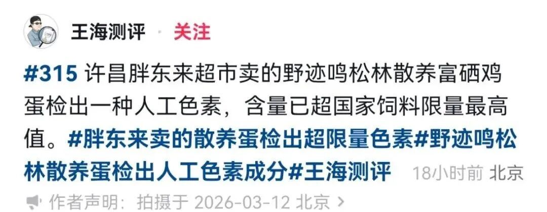 除了“黄天鹅”,“王海测评”称,胖东来超市售卖的野迹鸣(松林散养)富硒蛋检测角黄素(斑蝥黄)含量为9.54mg/kg,超出农业农村部发布的《饲料添加剂安全使用规范》蛋禽类饲料中斑蝥黄允许的最大添加量8mg/kg。