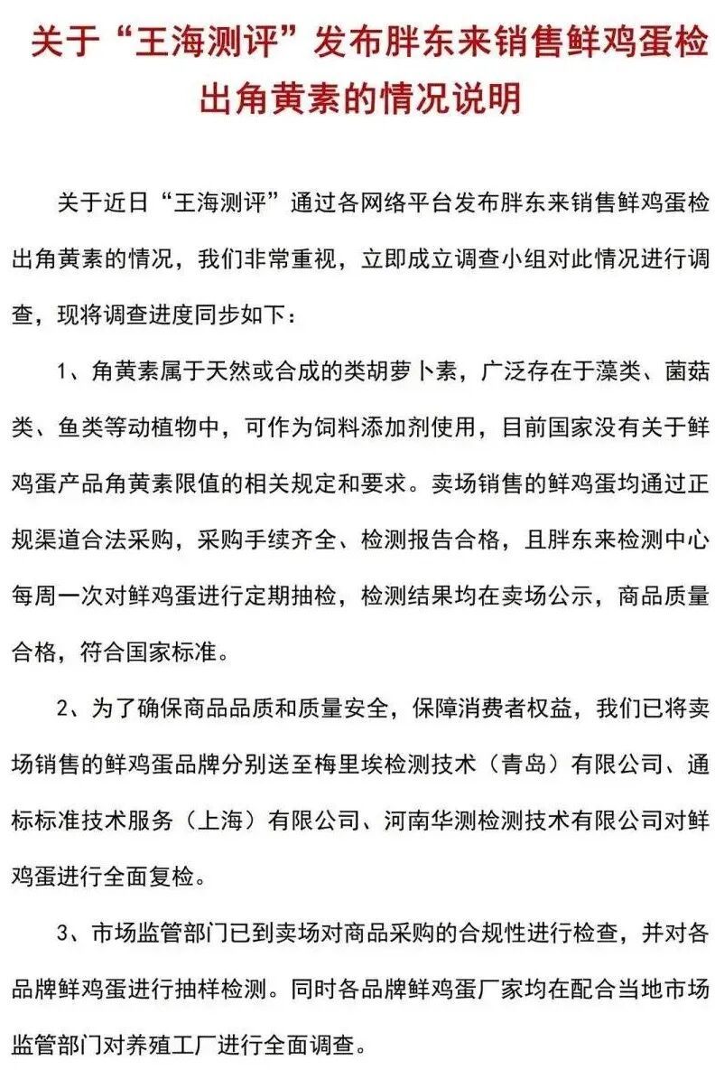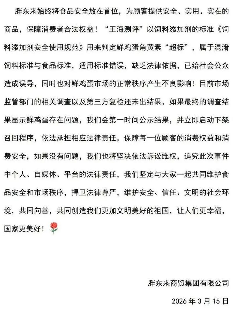 3月15日晚,胖东来发文回应称,目前市场监管部门的相关调查以及第三方复检还未出结果,如果最终的调查结果显示鲜鸡蛋存在问题,会第一时间公示结果,并立即启动下架召回程序,依法承担相应法律责任。如果没有问题,胖东来也将坚决依法诉讼维权,追究此次事件中个人、自媒体、平台的法律责任。