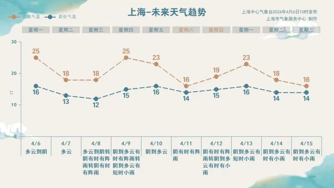 今日天气:今天是小长假最后一天,上海是多云到阴的天气。受弱冷空气影响,下午风力加大,北到东北风4—5级阵风6级,沿江沿海地区5级阵风6—7级。早间气温不算低,全市普遍在16—19℃之间,徐家汇站为18.3℃。预计白天最高气温可达25℃附近,午后体感温暖舒适。相对湿度90%—65%。 天气趋势:明天是节后首个工作日,多云为主,气温降至13—18℃之间。早晚偏凉,上班上学路上记得加一件外套。周三起,西南暖湿气流变得活跃,上海多降雨过程。气温走高,周四最高气温可达25℃。降雨间歇期间可能出现低能见度天气,大家要多多留意临近的预报预警信息,合理安排生活及出行。 这 个 假 期 有没有来静安青年体育公园 在“会开花”的河滨绿道跑进春天 还是在苏州河畔的苏河湾万象天地 沉浸式体验70+苏式美学品牌集结的 “春韵苏河【苏FU】美学生活集” 在玉兰堂(上海)、苏河皓司、 Fotografiska 影像艺术中心、瑀空间…… 看一场正在展出的展览 或是去赏花! 去青海路拾影花园 看樱花与园林造景的完美契合 去静安雕塑公园 看樱花的柔美与现代雕塑的冷峻 走出汶水路站 看列车驶入粉色云霞的樱花车站 静安春天的浪漫正在上演 趁着假期 感受明媚的春光 以崭新的状态拥抱新一轮的生活! 编辑:梁慧 部分图片:图虫创意 部分来源:上海天气发布微信公众号