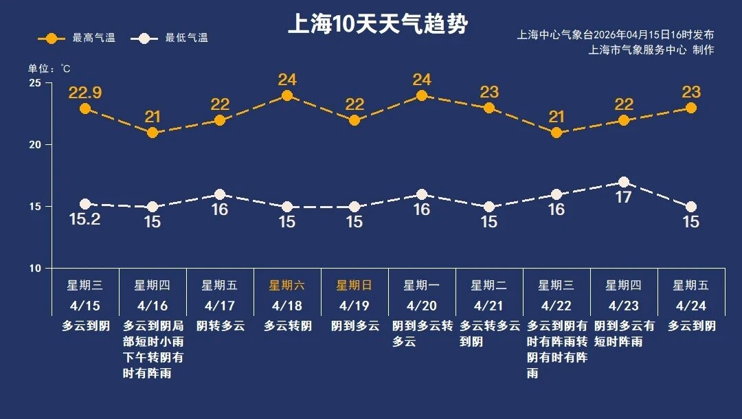最低气温15℃,最高21℃,