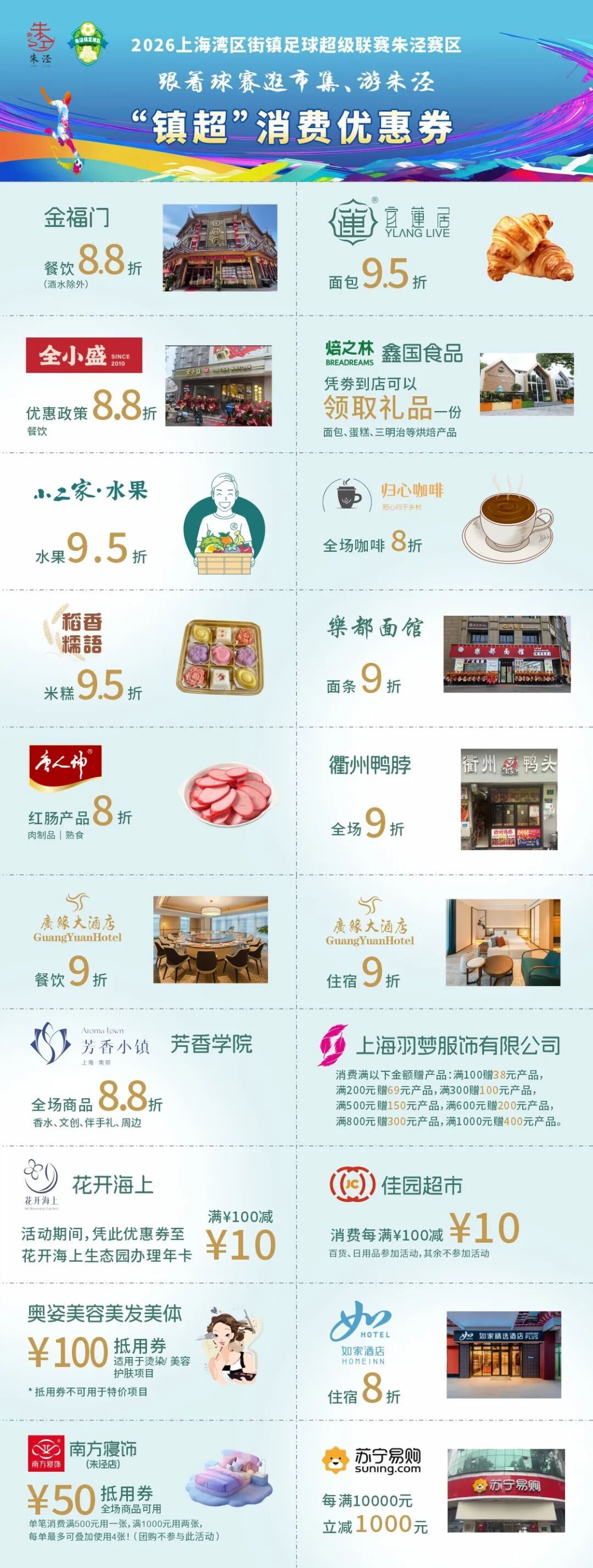 “镇超”不仅是一场足球赛事,更是激活金山商业、文旅活力的有力催化剂。朱泾镇精心打造“看球赛、逛集市、品美食、游朱泾”的闭环消费体验,在球赛现场免费发放镇超“消费有礼”优惠券——2026年4月18日至7月31日期间,球迷观众持消费优惠券可在参与活动的商户、酒店、景区享受优惠折扣,千万不要错过哦~
