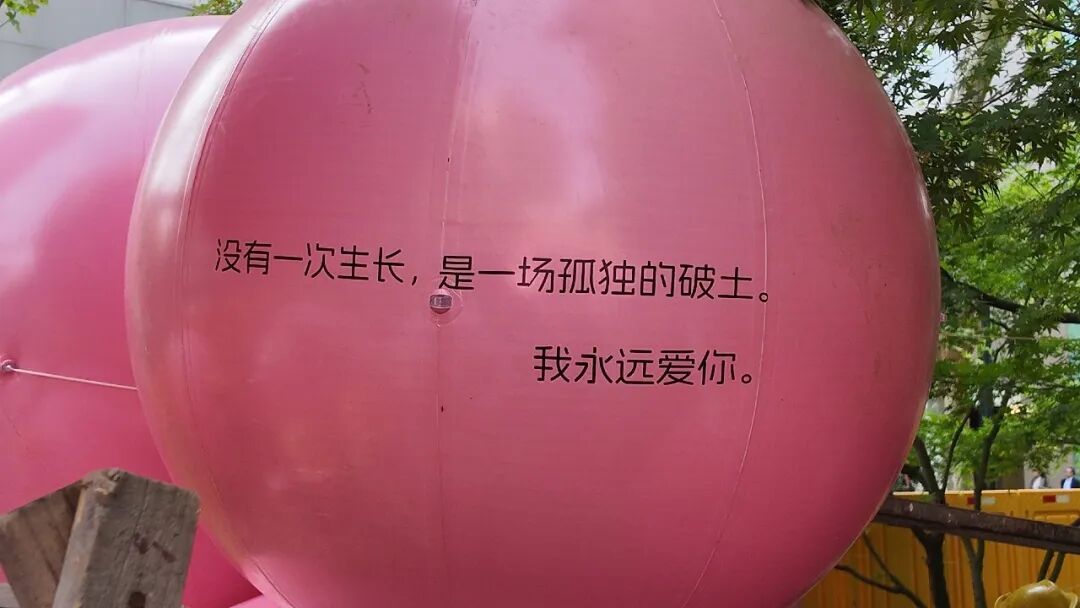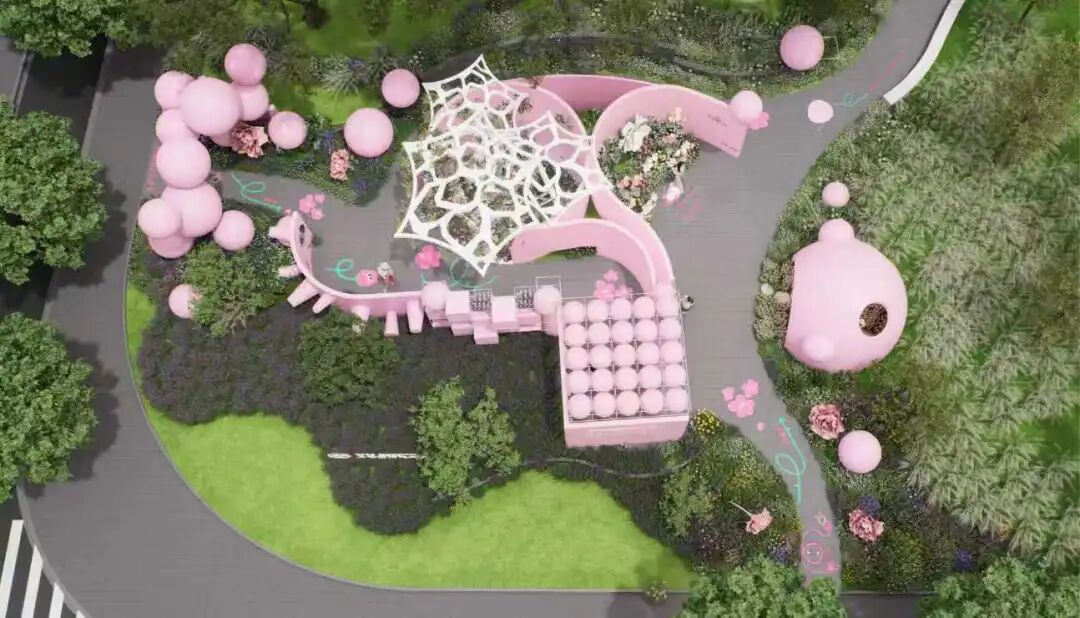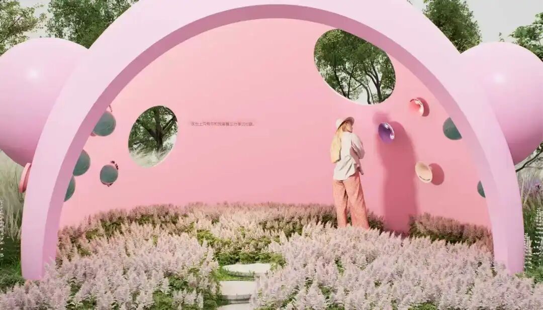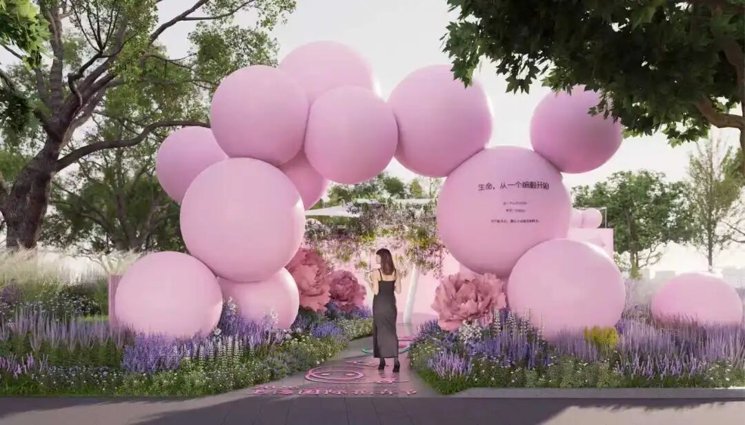 “启程”—— 生命萌芽的悸动:以盛放花海为起点,象征生命初始的纯粹,错落的粉色泡泡装置轻盈浮动,具象化定格生命萌芽的美好,正式开启这场关于新生的温柔旅程。