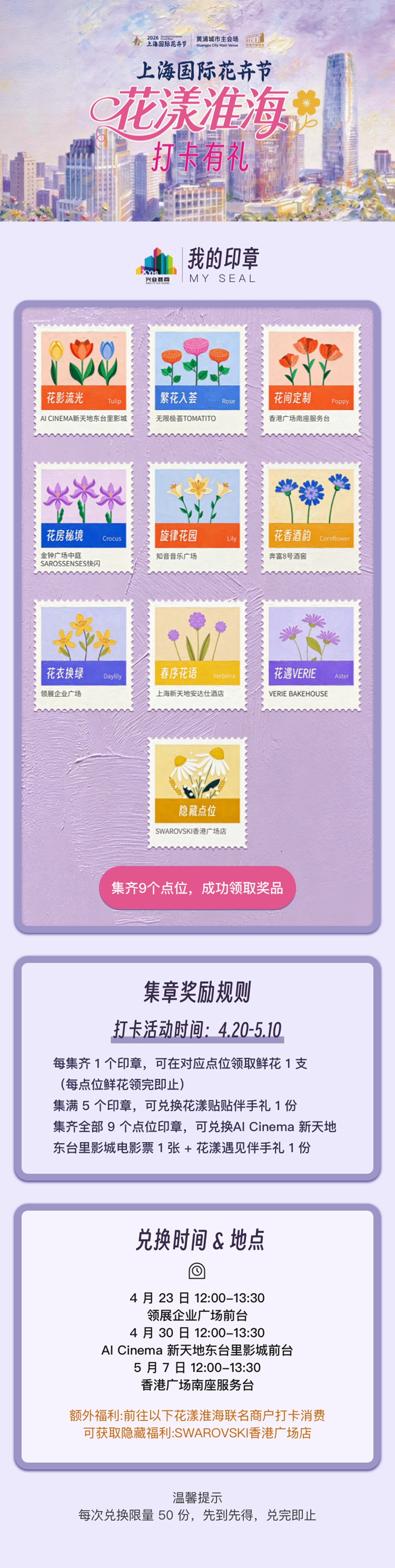 4月18日-5月10日,消费者在以上点位空间及所在商场内消费满50元,或者拍照打卡花艺装置并带#上海国际花卉节#花漾淮海#淮海中路街道#话题发布小红书笔记,出示凭证即可获得该点位专属印章:
