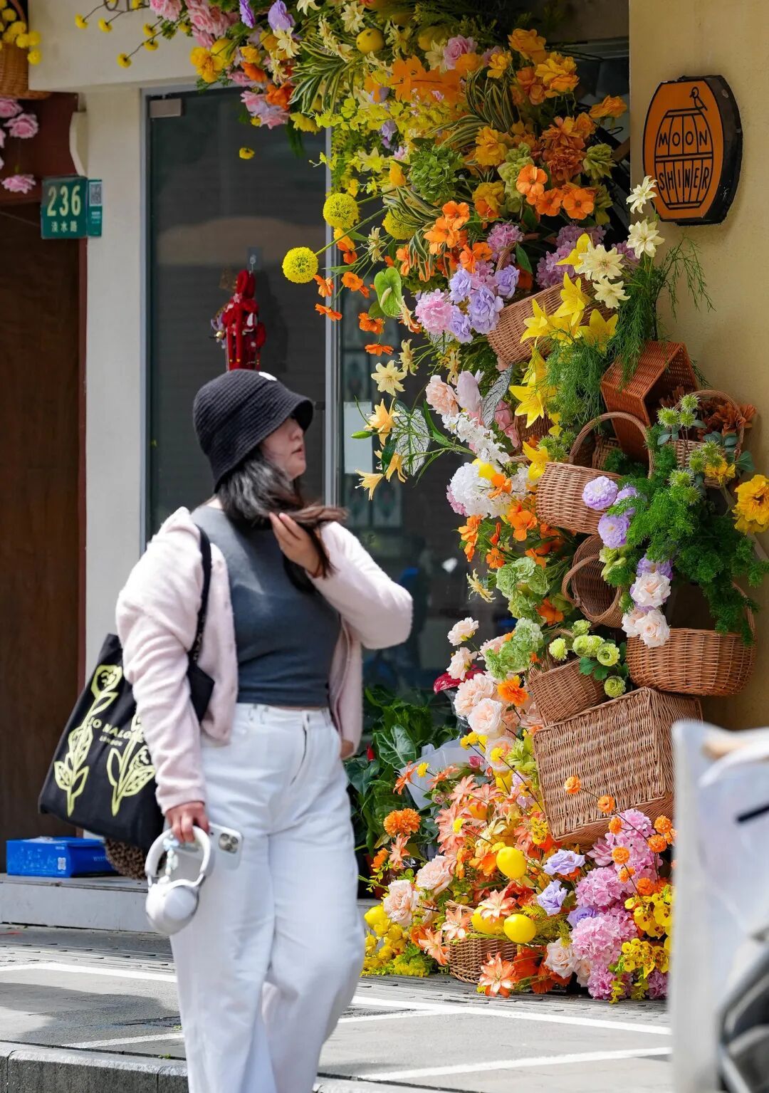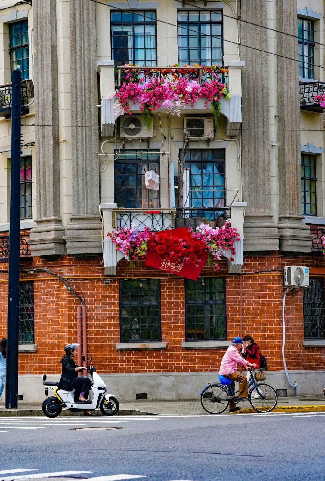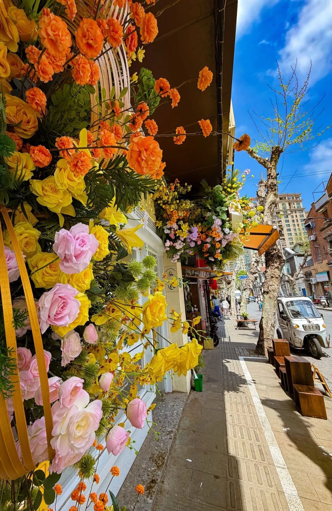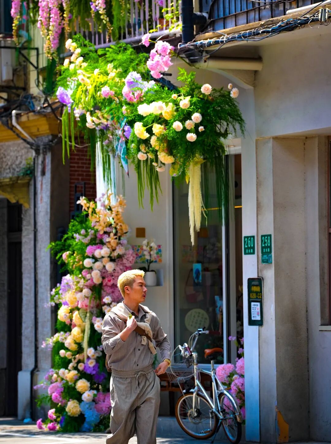 最妙的是,这些花并非自然生长的花卉,而是为花卉节特别定制的商业街区花艺景观。石库门的青砖墙与现代花艺撞个满怀,老建筑的底蕴和春天的时髦感居然毫不违和——烟火共生,美学也共生。