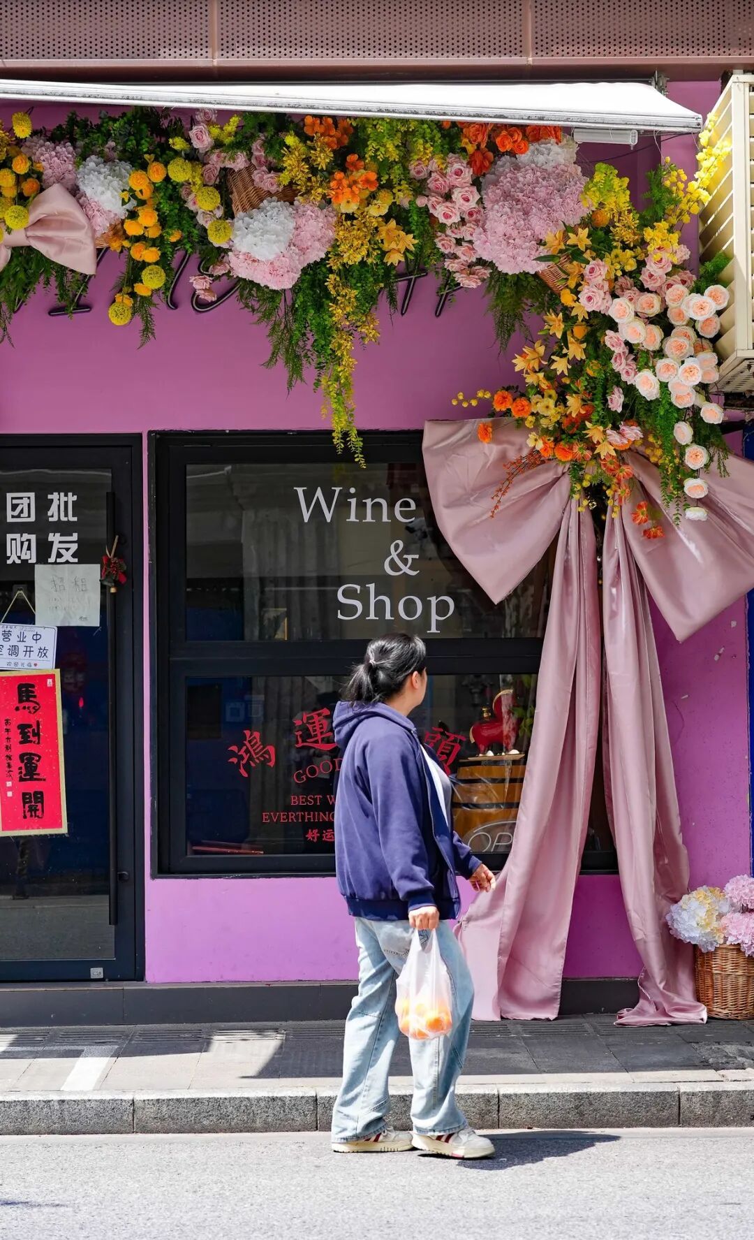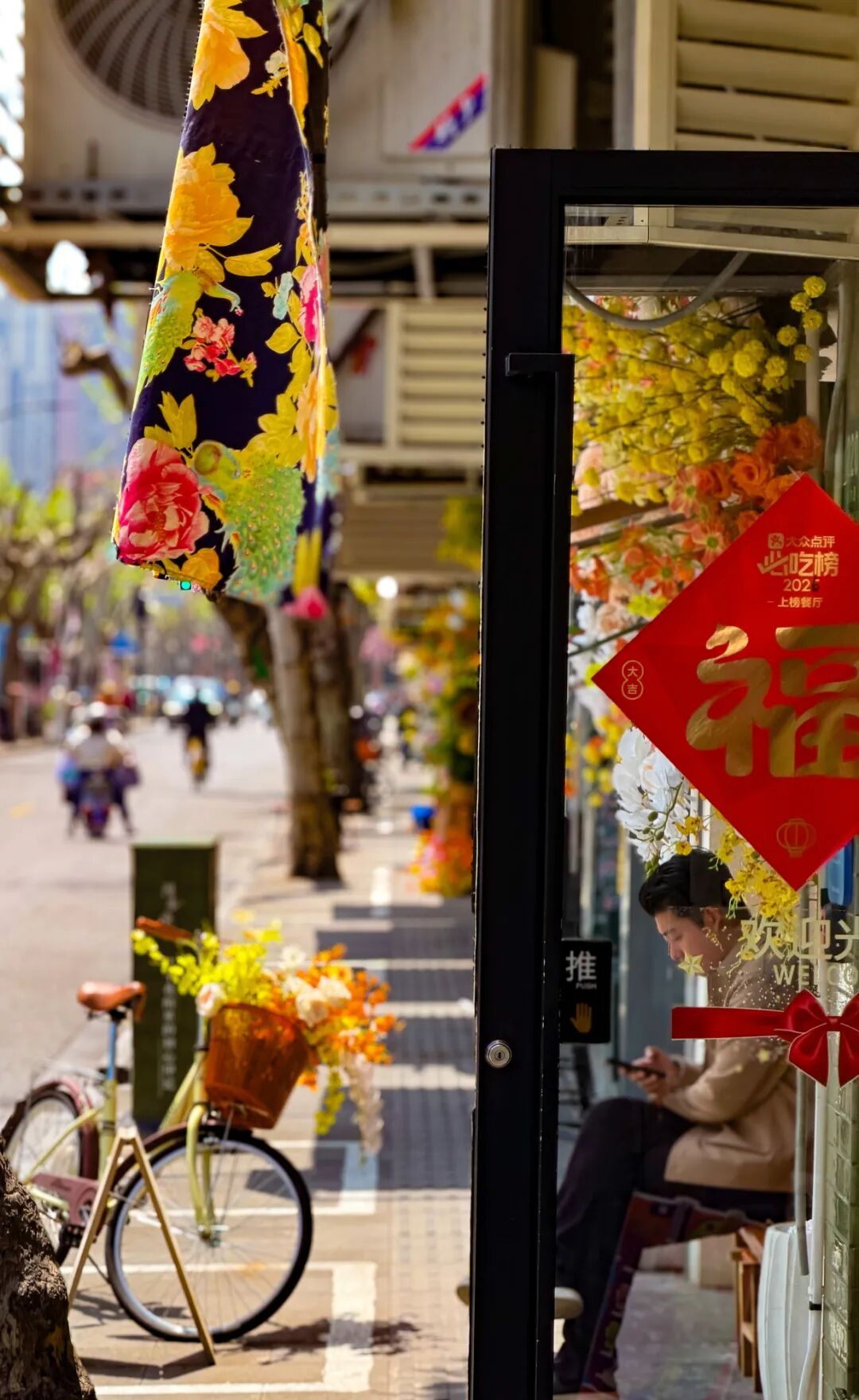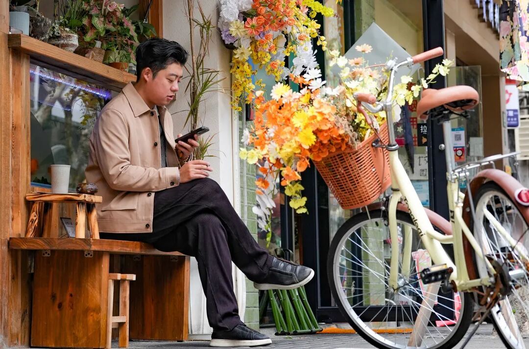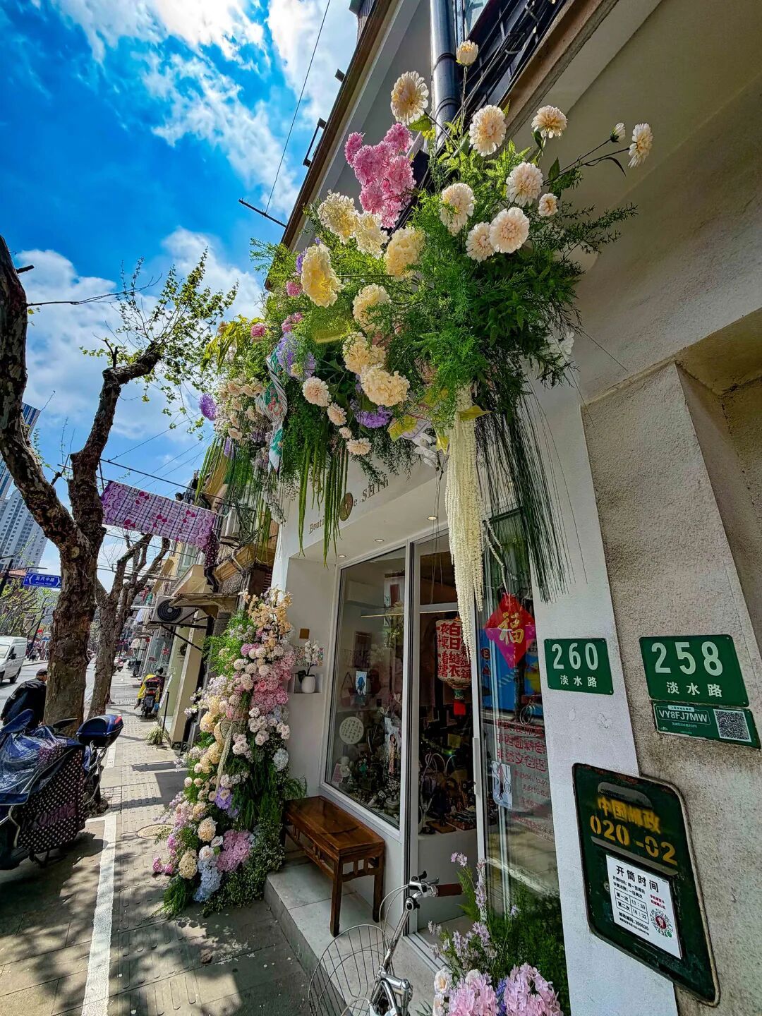 咖啡店的门口攀着藤蔓与绣球,甜品店的窗台盛开着莫奈色系的花束,非遗手作店里插着新中式插花……一店一景,一店一花语,走完整条街就像翻完一本立体的春日画册。