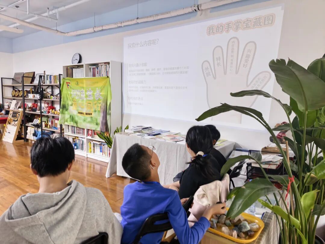 探索外部世界的同时,活动也引导孩子们将目光转向自身。在社工的带领下,孩子们把自己的手掌画在纸上,以此为“藏宝图”,在五个手指及掌心区域分别记录下自己的特长爱好、内在品质、他人眼中的自己、优点与待改进之处等内容。
